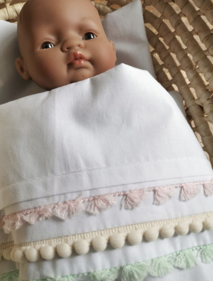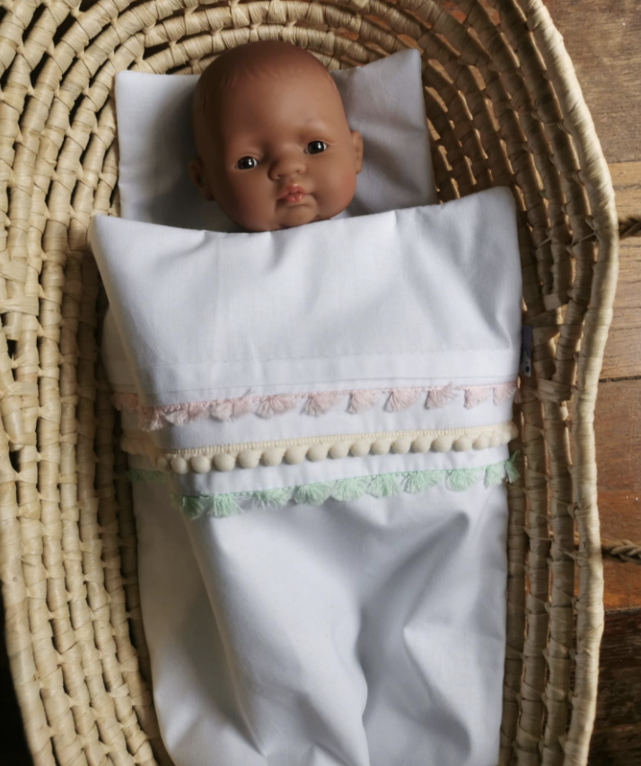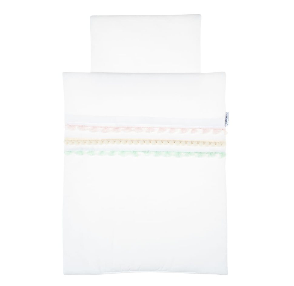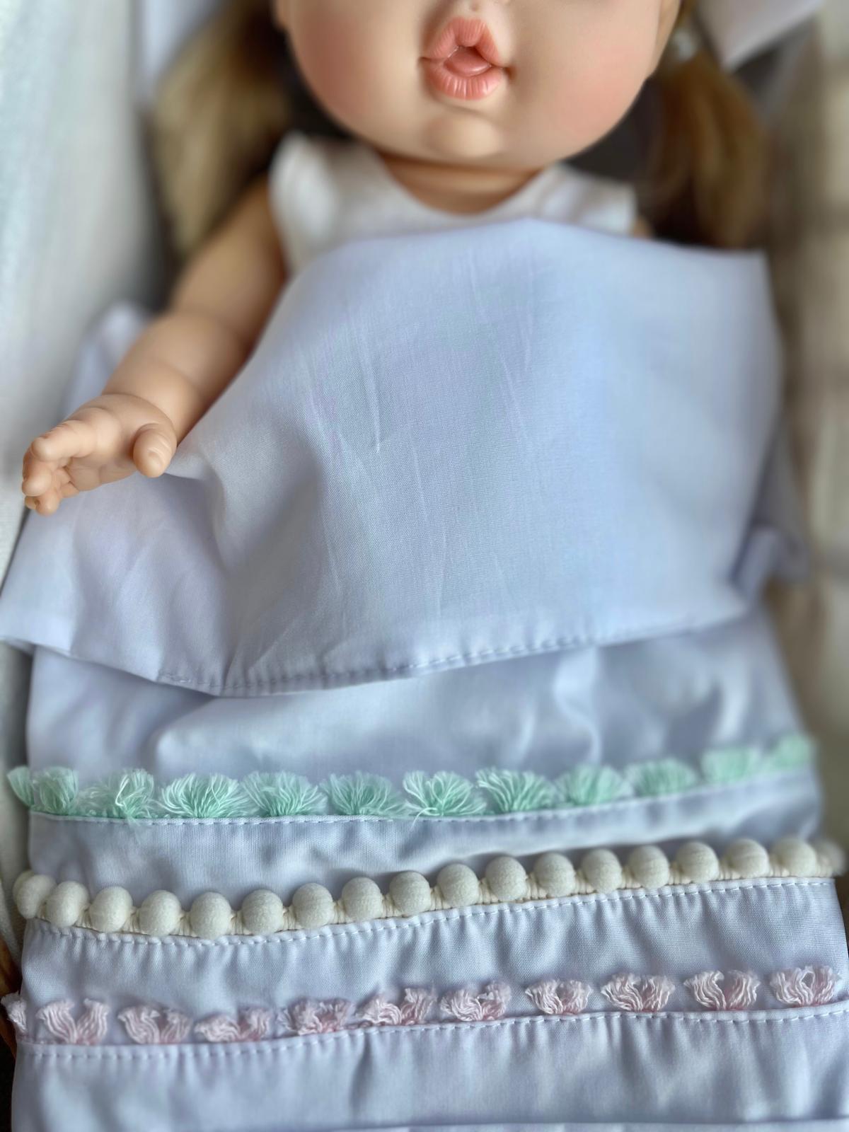 Ta piękna pościel uszyta jest z mięciutkiej tkaniny bawełnianej w białym kolorze i ozdobiona jest frędzelkami i pomponikami w pastelowych kolorach. Idealna dla ukochanej lalki lub innej przytulanki dopełni każdą zabawę Twojego dziecka.