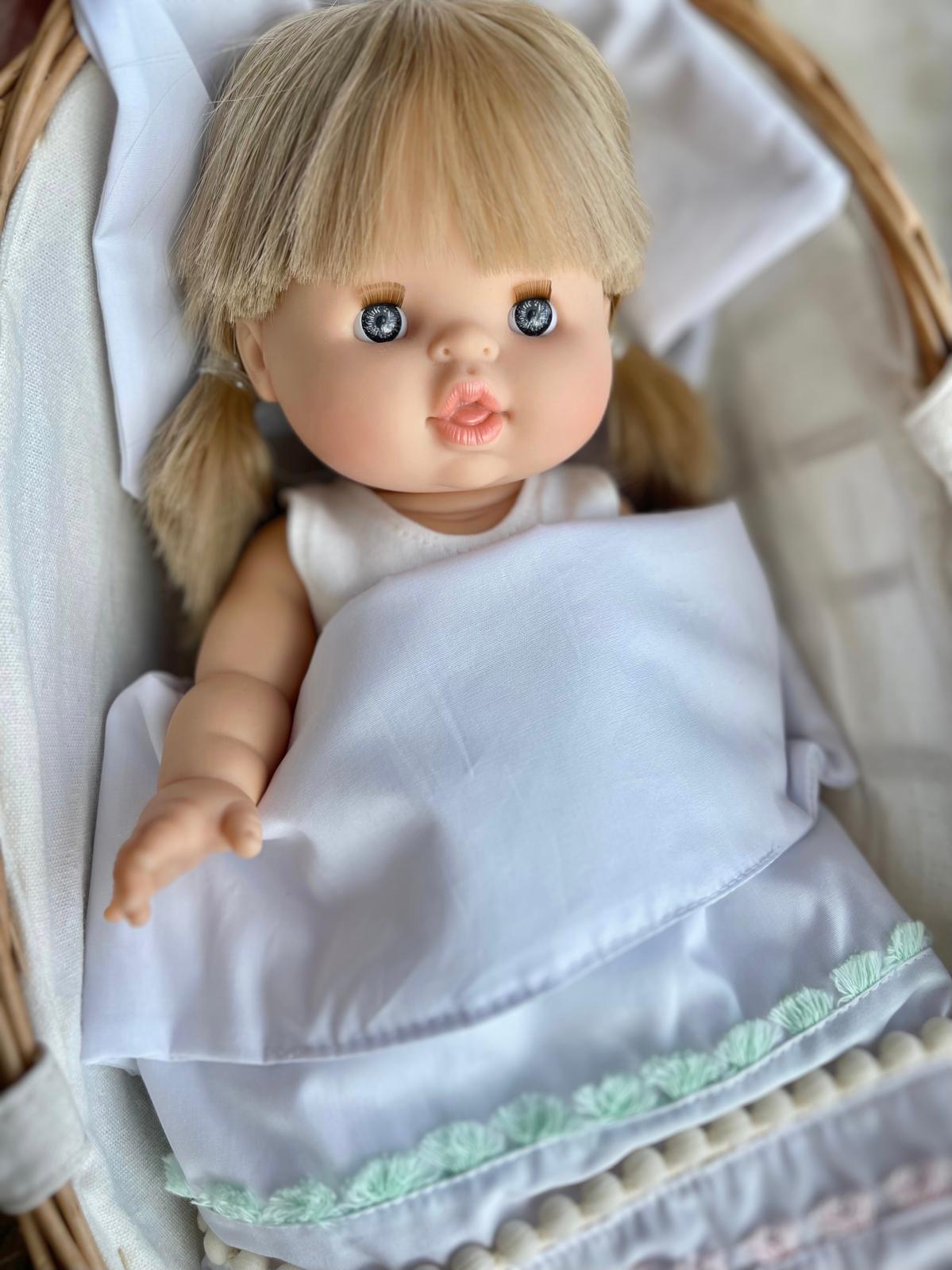 Pościel pasuje do kosza Mojżesza dla lalek lub do innego łóżeczka.