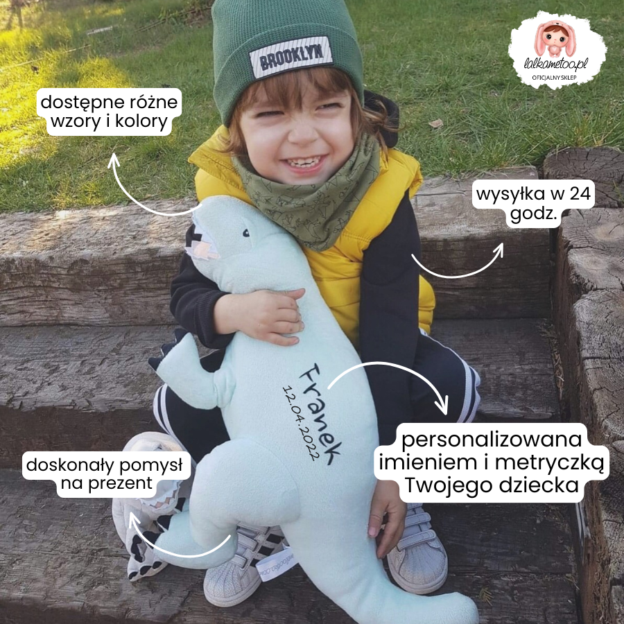 Pluszak-dinozaur wykonany jest z pastelowego, miętowego i przede wszystkim miękkiego pluszu, który idealnie wpisuje się w ponadczasowy i słodki skandynawski design. Taką zabawkę pokochają wszystkie maluchy, dla których paleontologia jest największą pasją! Uniwersalność kolorów odpowiada współczesnym trendom, a zatem pluszowy T-Rex jest i dla słodkiego urwisa i dla cudownej księżniczki! Jeśli zatem poszukujesz ponadczasowego i idealnego pluszaka, który nie jest klasycznym misiem – Melootka ma dla ciebie doskonałą propozycję, którą możesz spersonalizować.