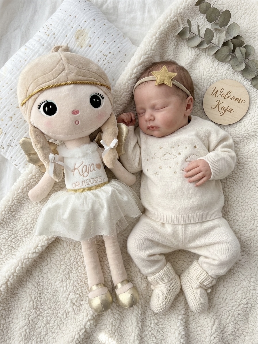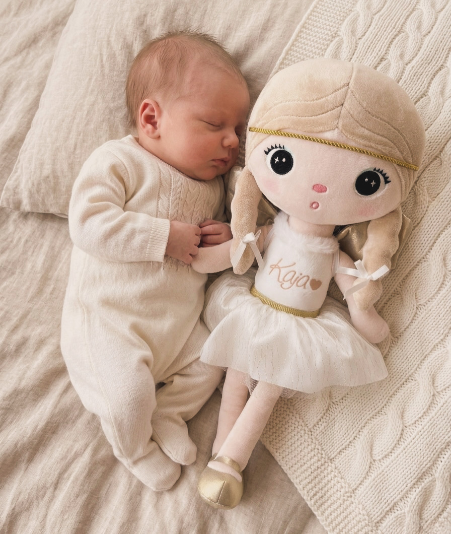 Biało-złota laleczka, ze względu na symbol Anioła, to piękny prezent na Chrzest Święty, Mikołaja i Gwiazdkę.