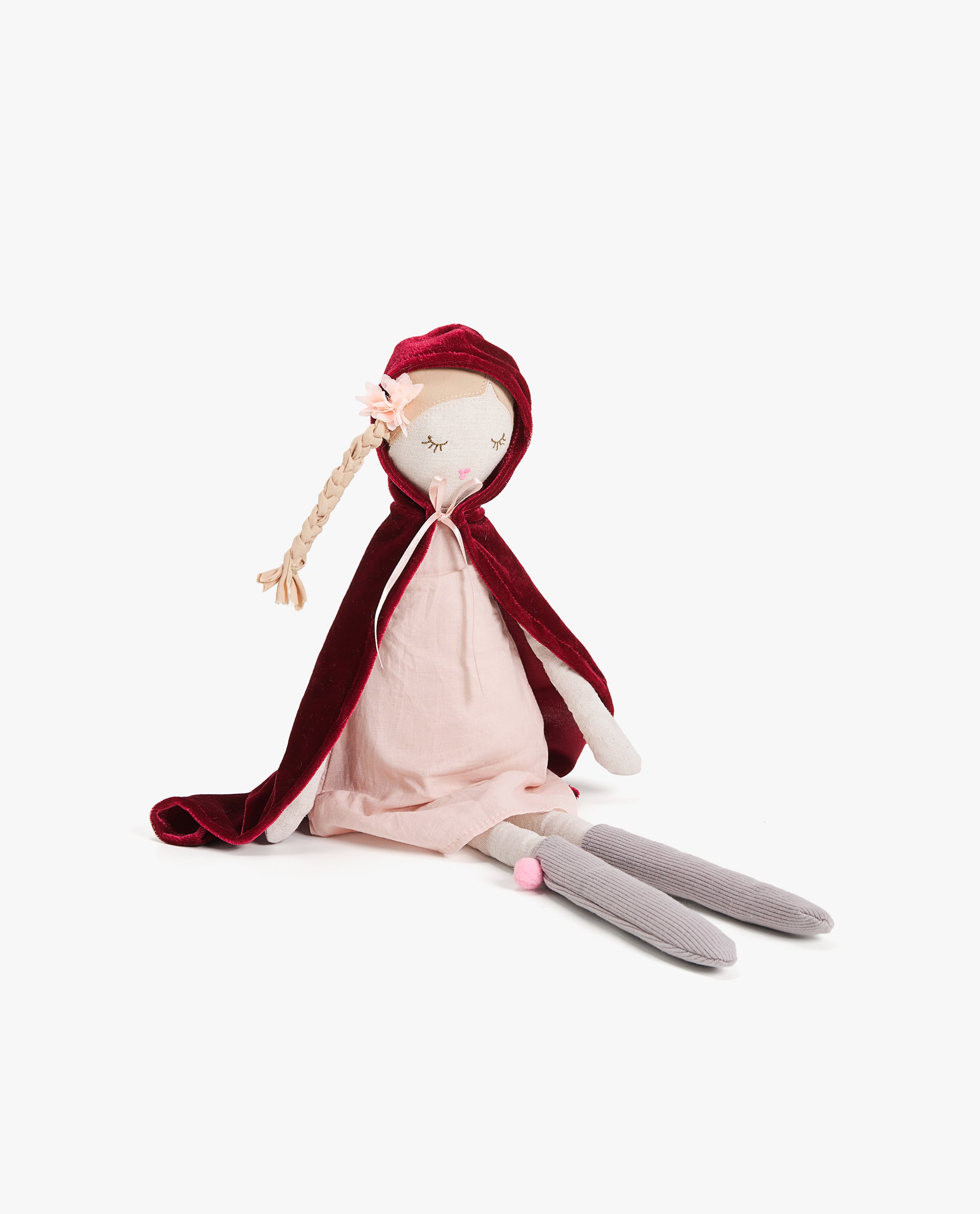 Przepiękna laleczka z materiału z plecionym warkoczem i czerwoną, aksamitną peleryną.