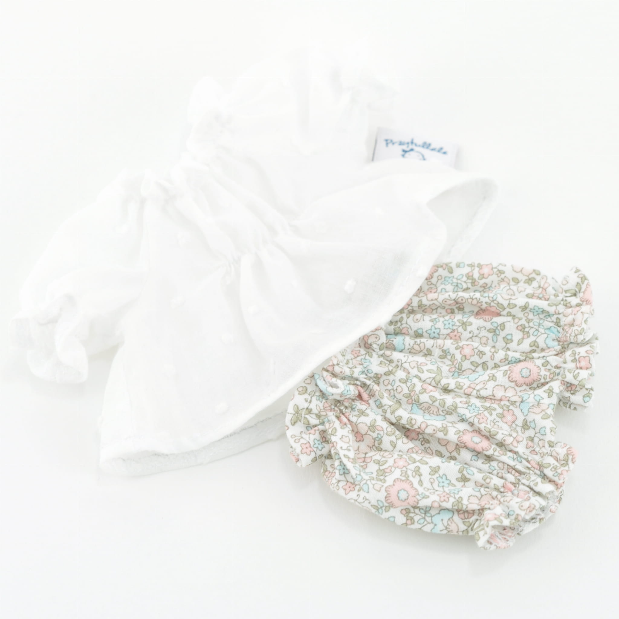 Dwuczęściowy zestaw składający się z bawełnianej bluzeczki w kolorze ecru oraz bawełnianych bloomersów z pięknym motywem w pastelowe kwiatuszki.