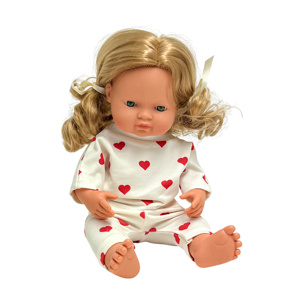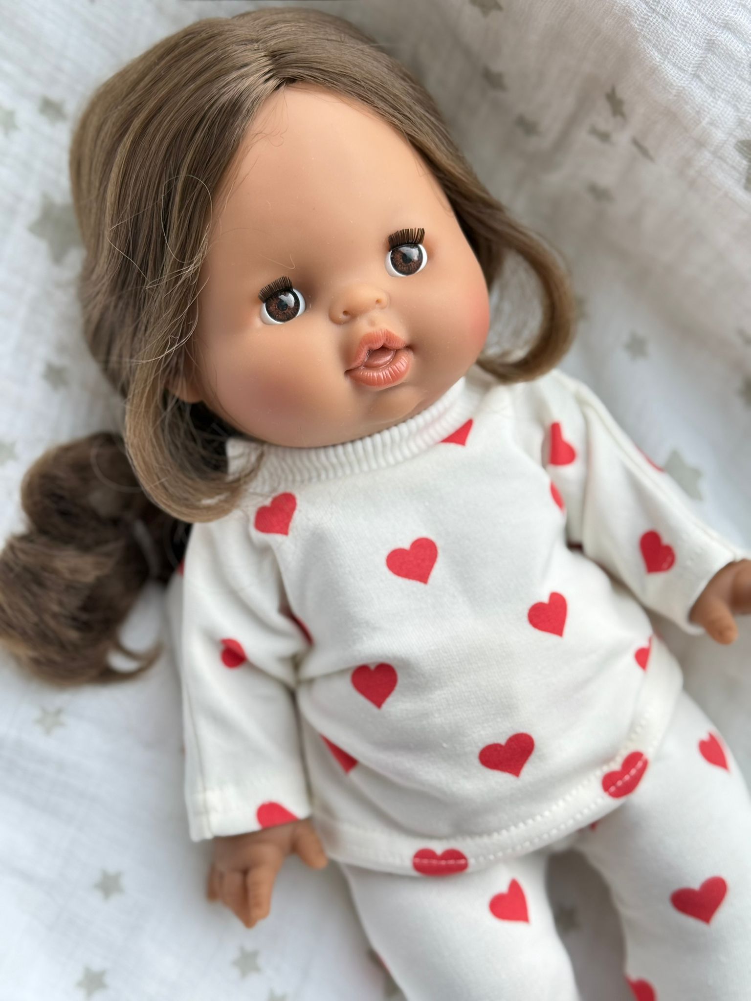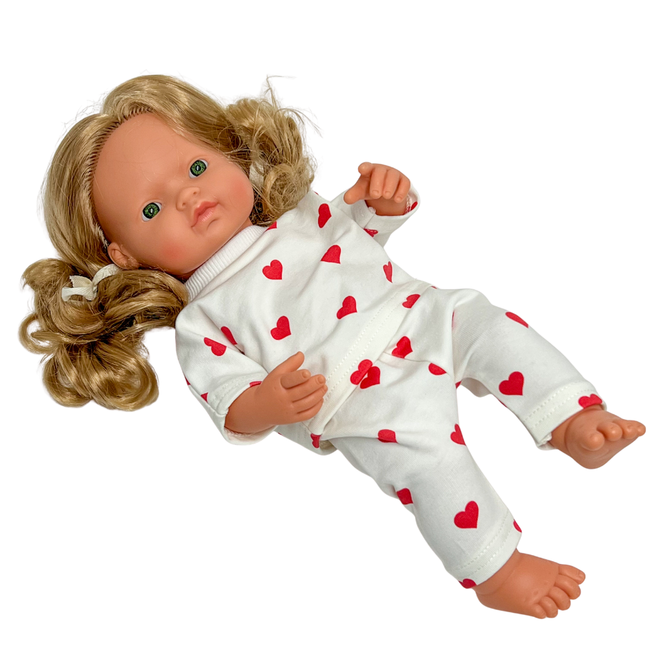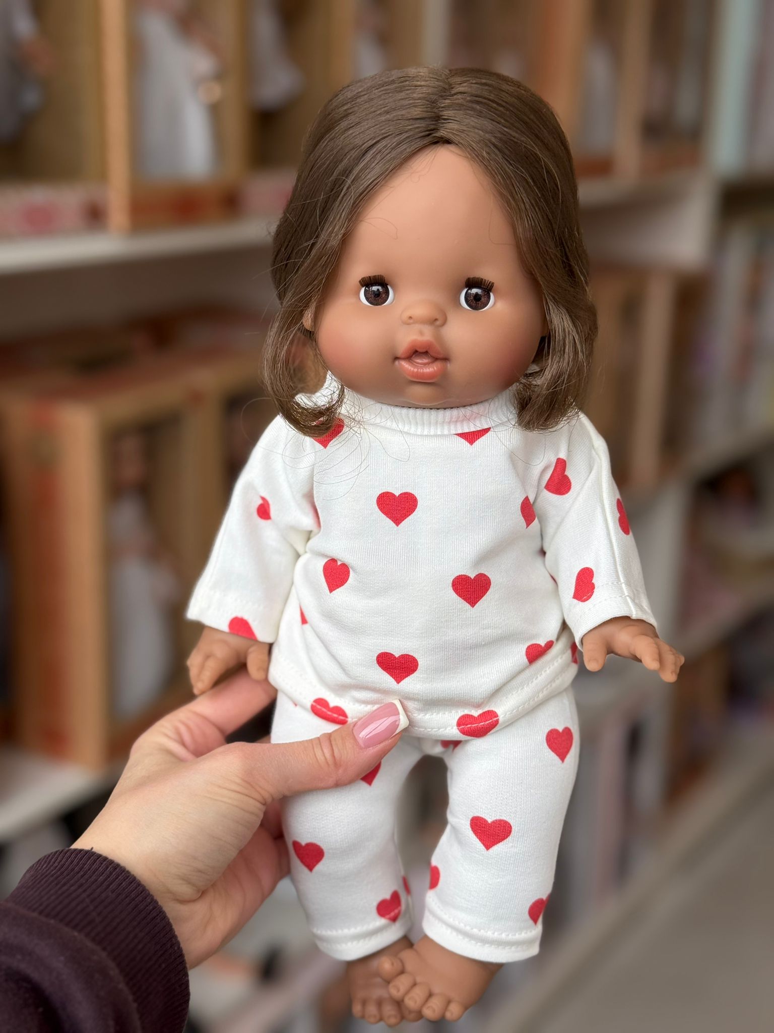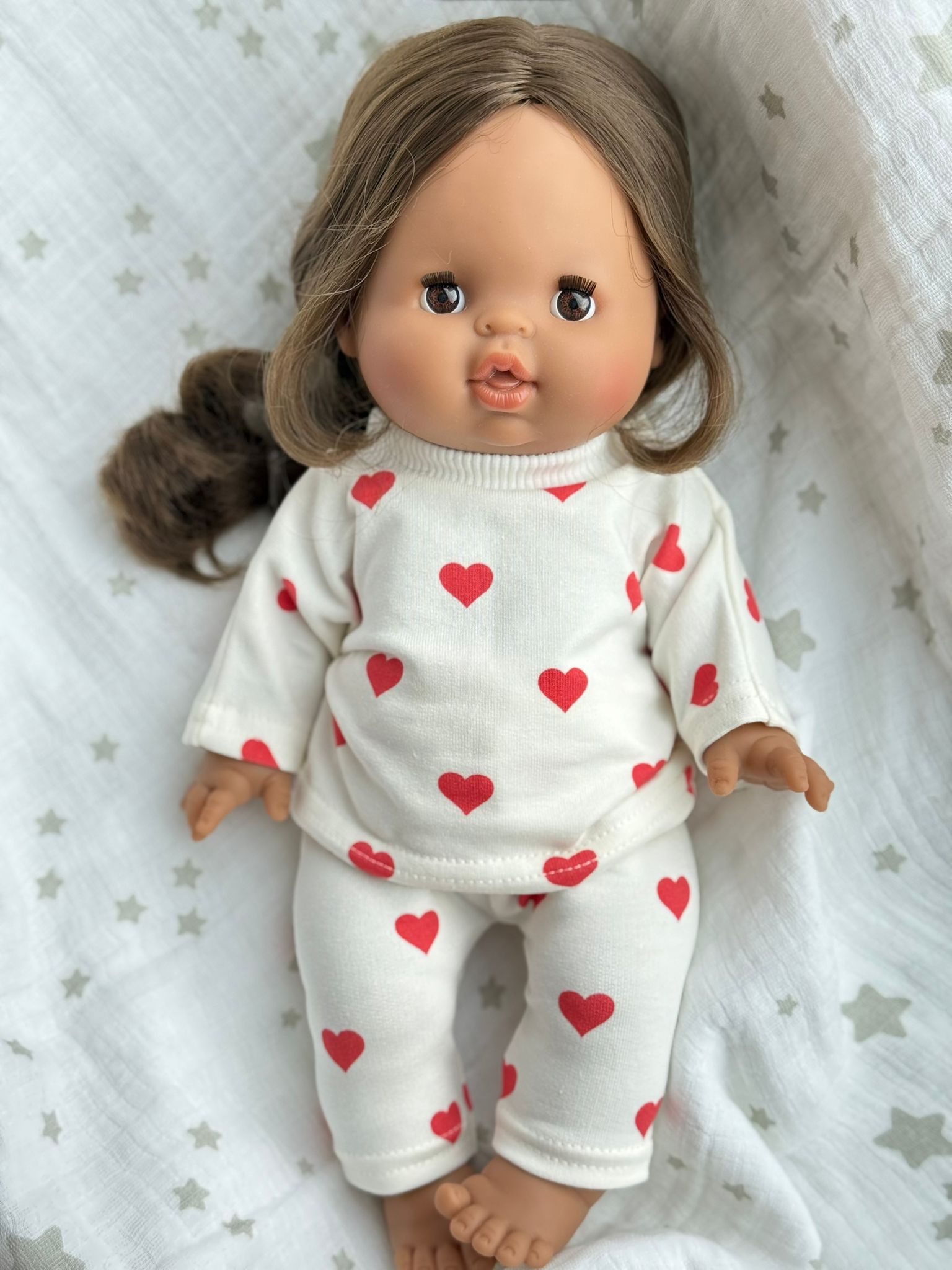Dres dla lalki bobas 34–38 cm Miniland, Minikane, Paola Reina – czerwone serduszka na kremie