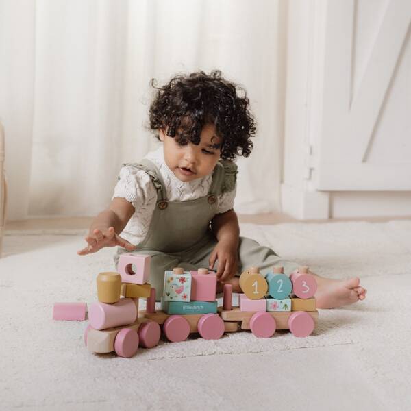 Pociąg Fairy Garden FSC od Little Dutch. Drewniany pociąg z klockami o różnych kształtach i kolorach oraz z pięknymi baśniowymi motywami z kolekcji Fairy Garden. Do trzech wagonów klocki można układać dowolnie wedle wyobraźni, przestawiać i łączyć. Pociąg składa się z 17 elementów i ma około 45 cm długości. Ta zabawka fantastycznie rozwija kreatywność i motorykę maluchów, umożliwia też poznanie pierwszych cyfr - 1,2 i 3. Stanowi świetny pomysł na prezent i doskonałe uzupełnienie dla pozostałych zabawek z kolekcji Fairy Garden od Little Dutch.