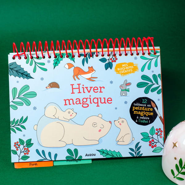 Kolorowanka wodna Magiczna zima Auzou. Kolorowanka do malowania pędzelkiem i wodą wielokrotnego użytku. W skład zestawu wchodzi 12 różnych kart z motywami bawiących się sympatycznych zwierzątek. W zestawie znajduje się pędzelek. Po pomalowaniu, po pewnym czasie karty wysychają i można je używać ponownie. Kolorowanki na sprężynce dla wygody każdego malucha. Świetny pomysł na spędzanie czasu oraz ćwiczenie rączki od małego dziecka. Idealne na podróż.