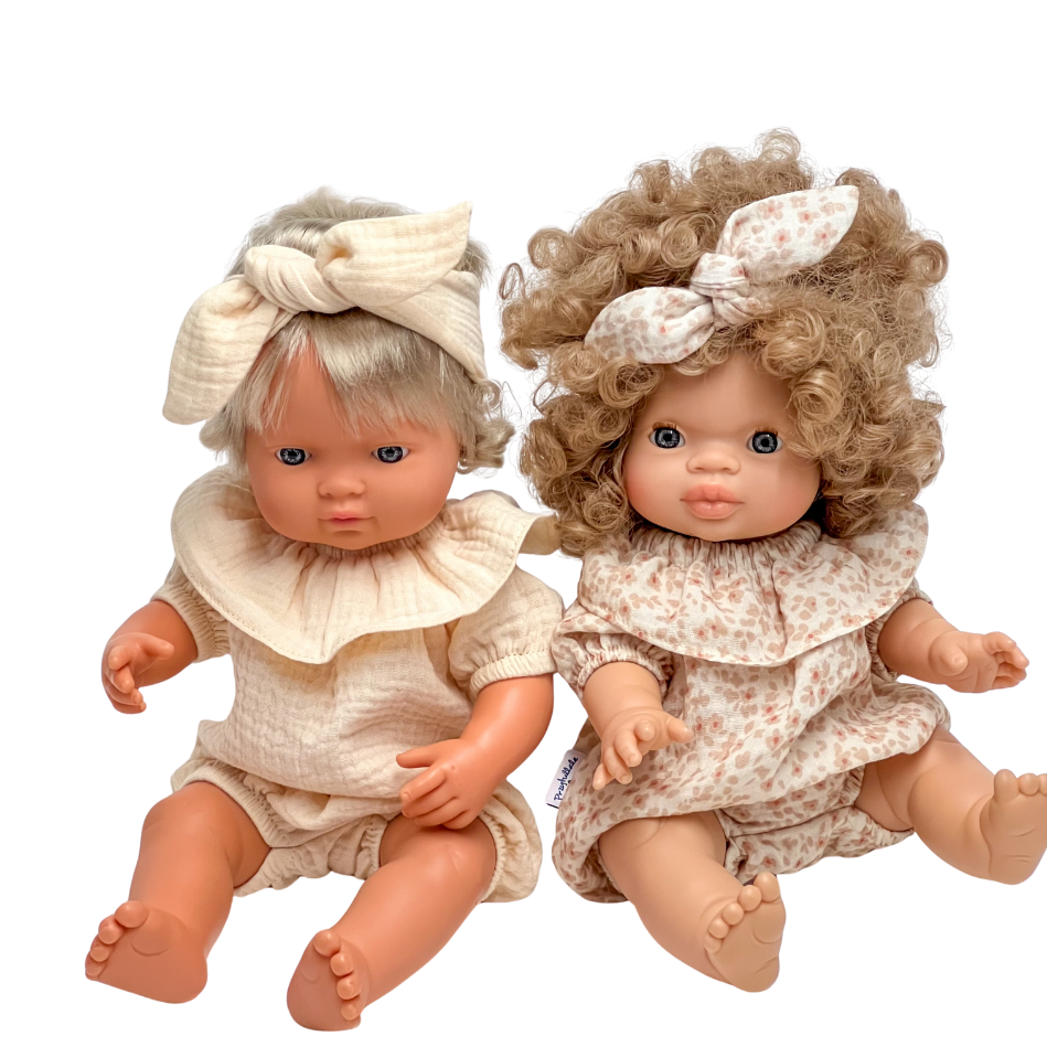 Stylowy i niezwykle delikatny komplet muślinowy to idealne ubranko dla lalek bobasów. W zestawie znajduje się jednoczęściowy kombinezon z uroczą falbanką oraz dopasowana opaska, które razem tworzą wyjątkową, spójną stylizację.
