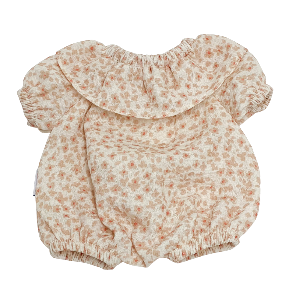 Kombinezon został wykonany z lekkiego, oddychającego muślinu, dzięki czemu zapewnia komfort podczas zabawy. Ozdobna falbanka oraz subtelna opaska dodają całości dziewczęcego uroku i elegancji.