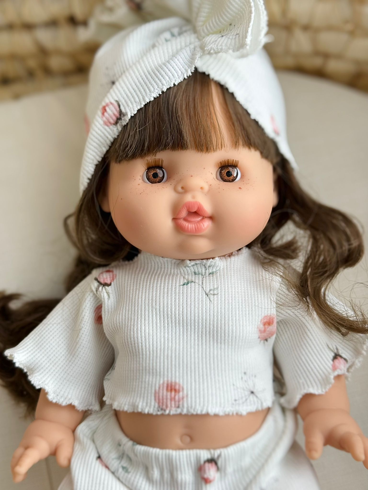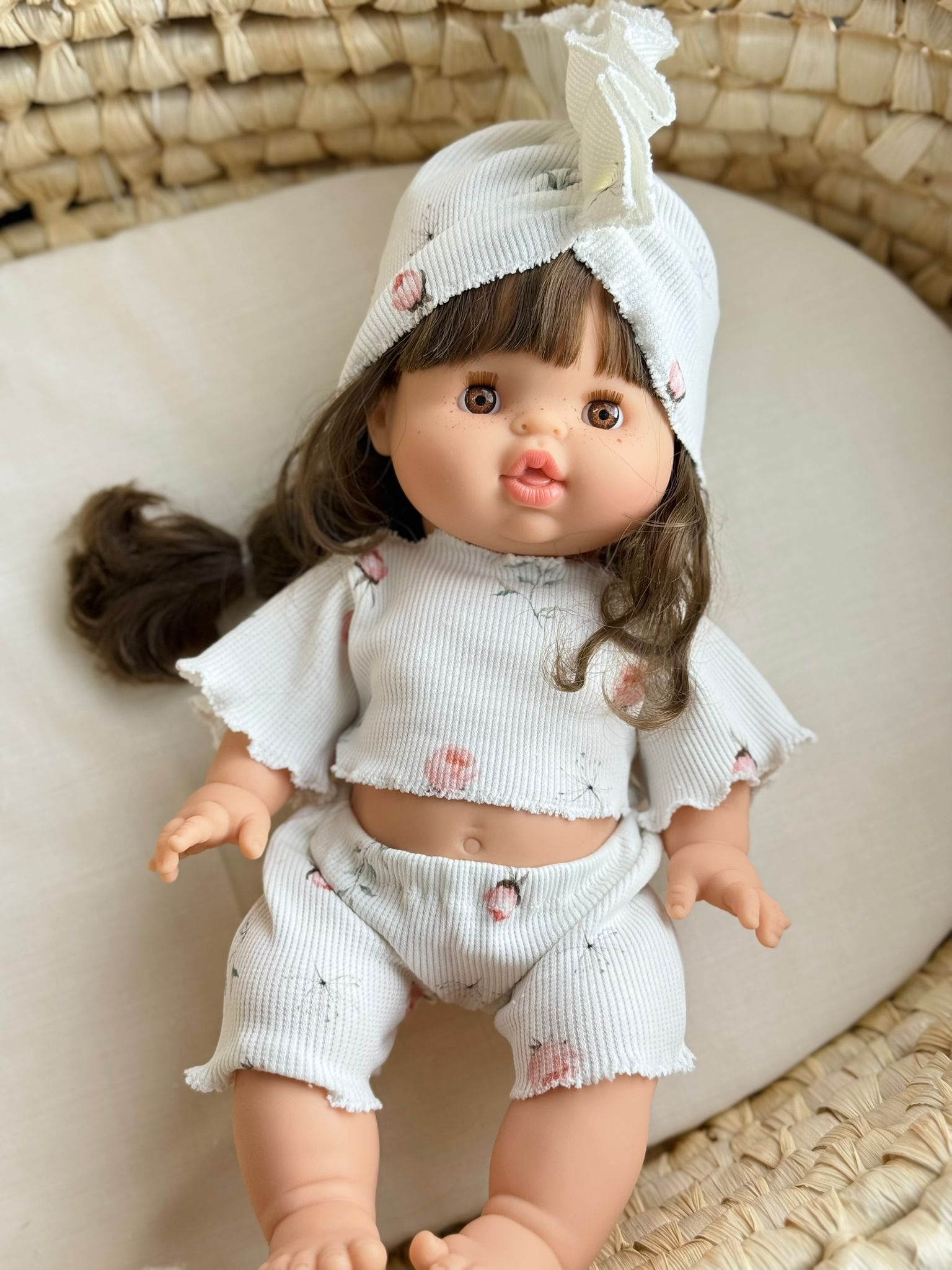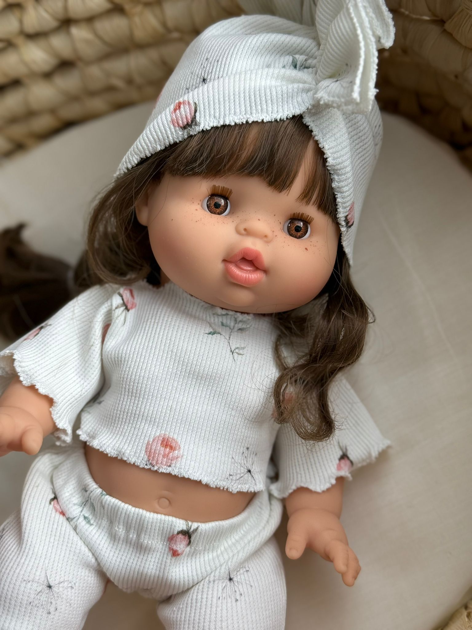 Uroczy, minimalistyczny komplet ubranek stworzony z myślą o laleczkach bobaskach. Wykonany z miękkiego, przyjemnego w dotyku materiału, zapewnia wygodę podczas zabawy i pięknie prezentuje się na lalce.