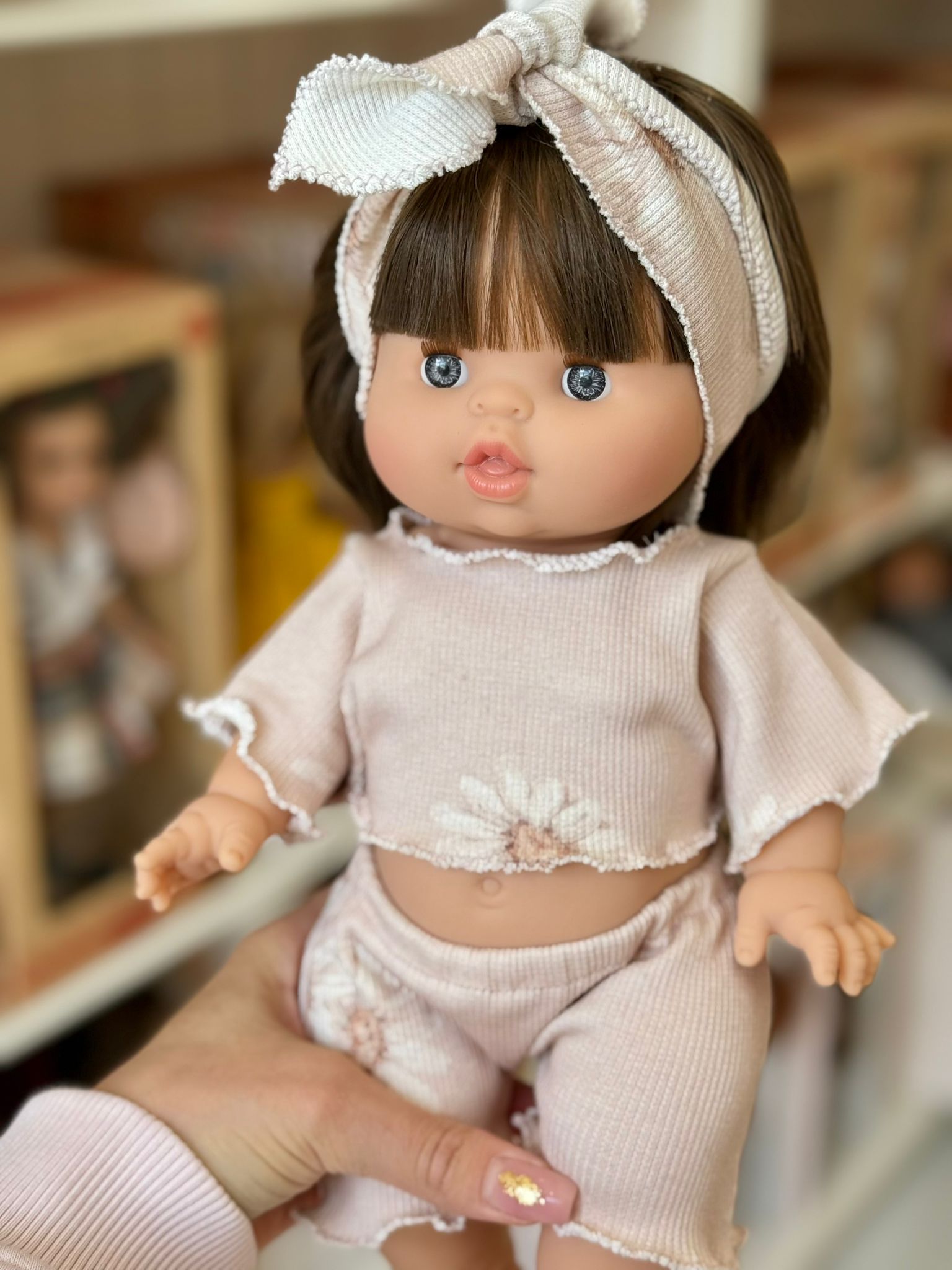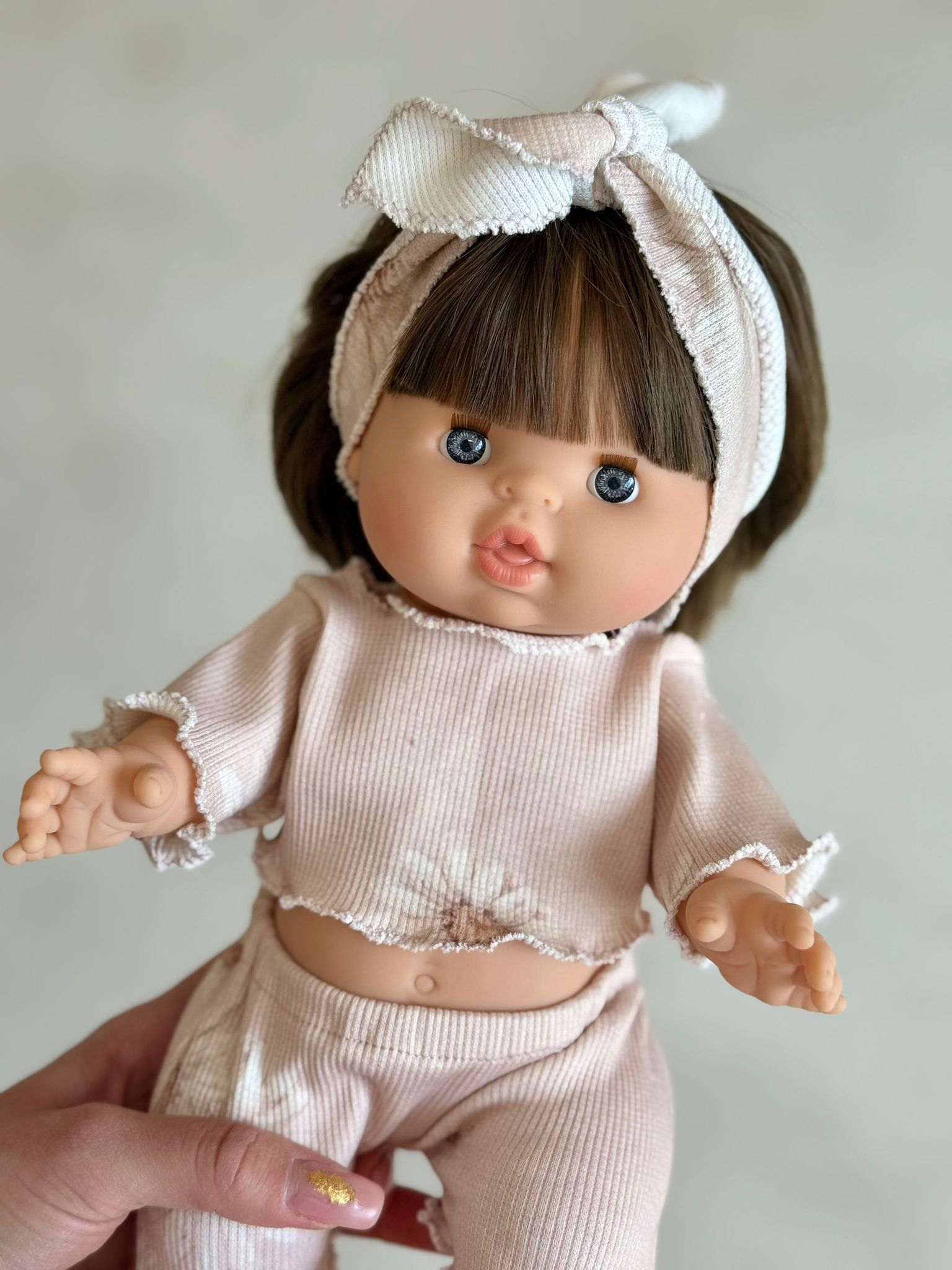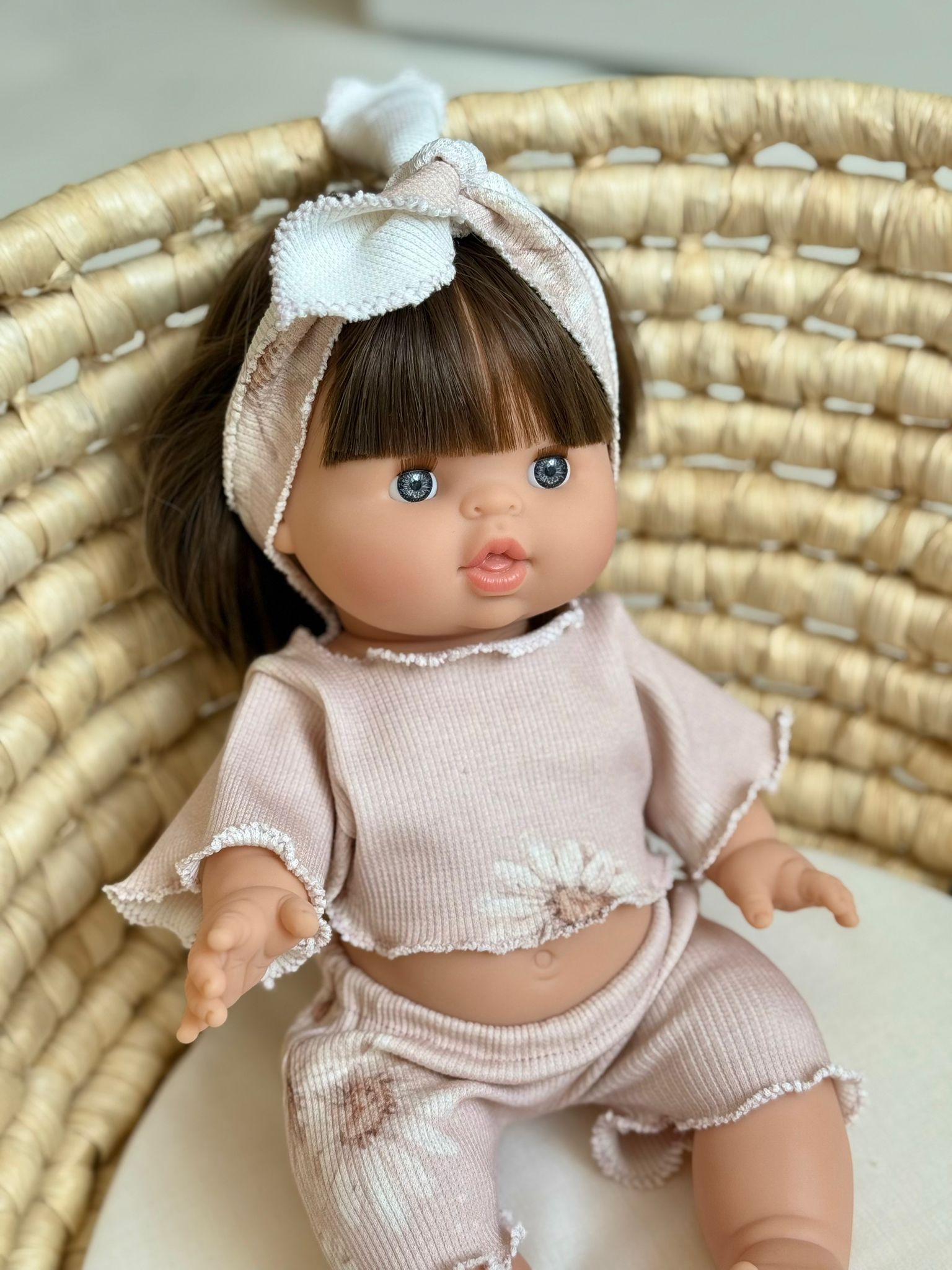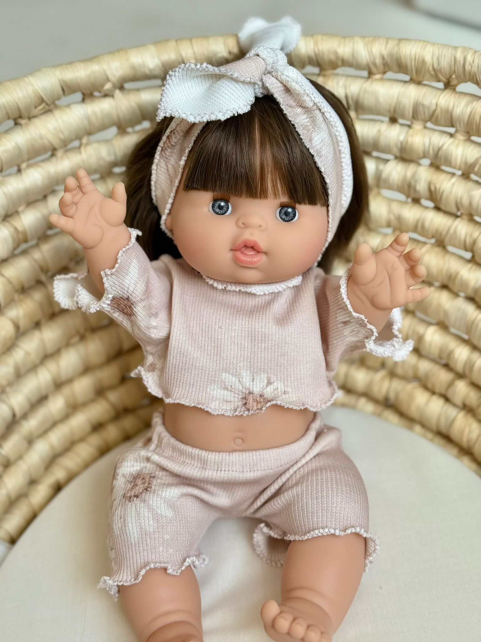 Stylowy i uroczy komplet dla lalki to idealny wybór dla każdej małej miłośniczki zabawy! Zestaw składa się z krótkiego topu i spodenek wykonanych z miękkiej, prążkowanej tkaniny w delikatnym odcieniu pudrowego różu, ozdobionej subtelnym kwiatowym wzorem. Ubranko ma romantyczny charakter dzięki falistym wykończeniom i uroczemu wiązaniu na głowę w komplecie.
