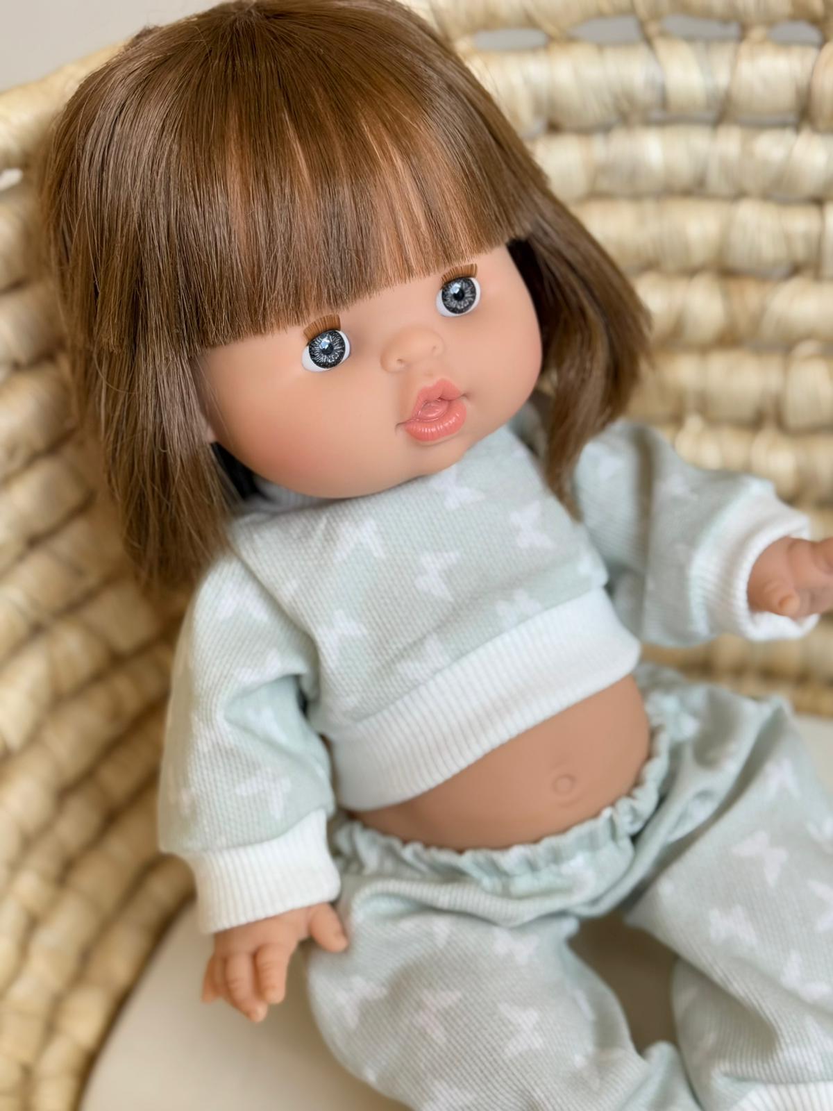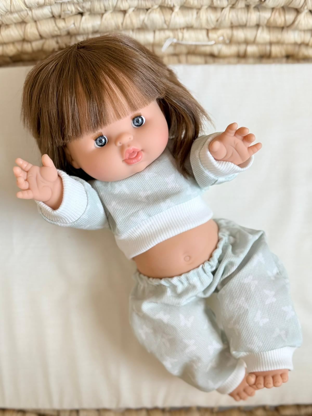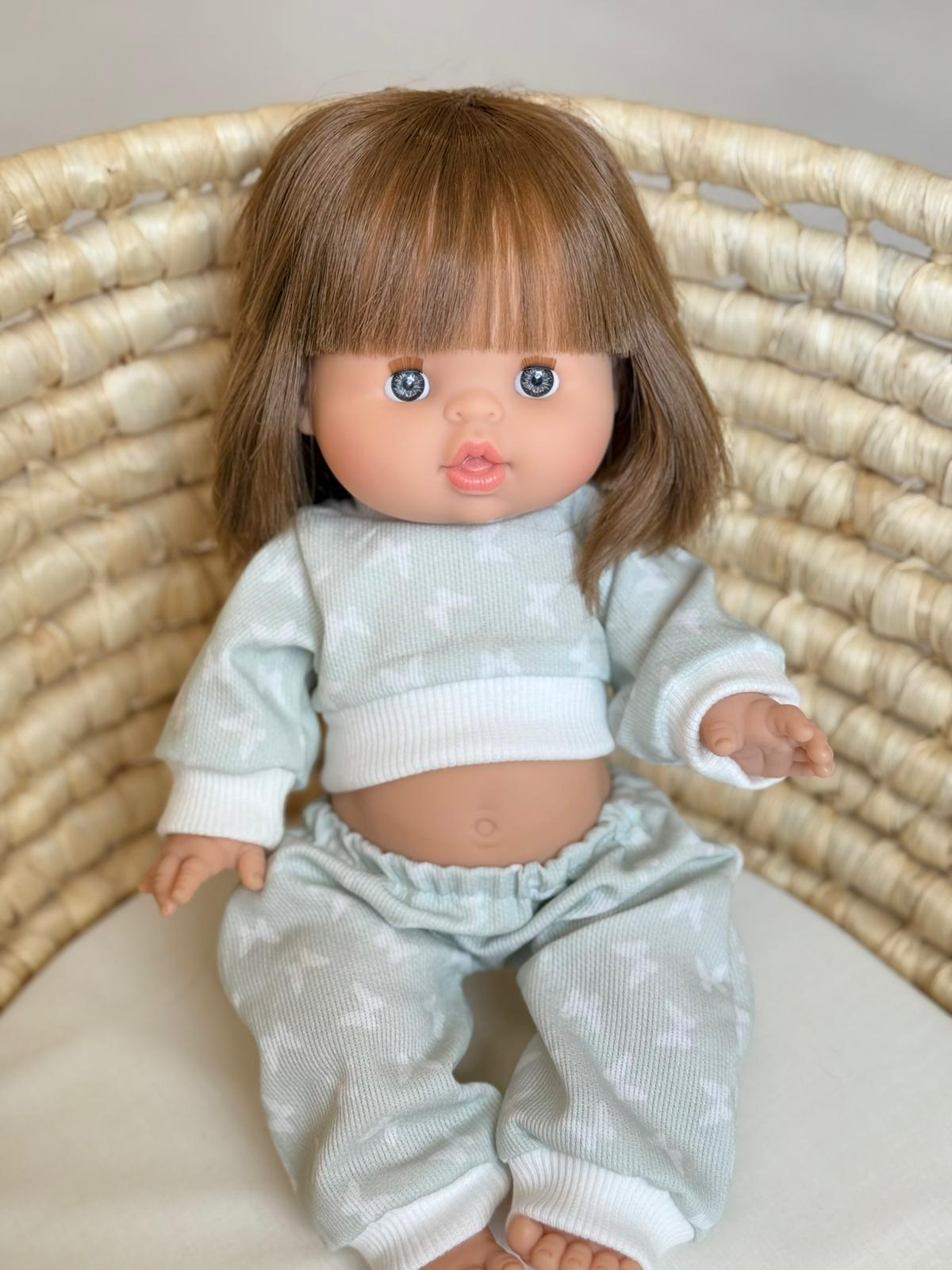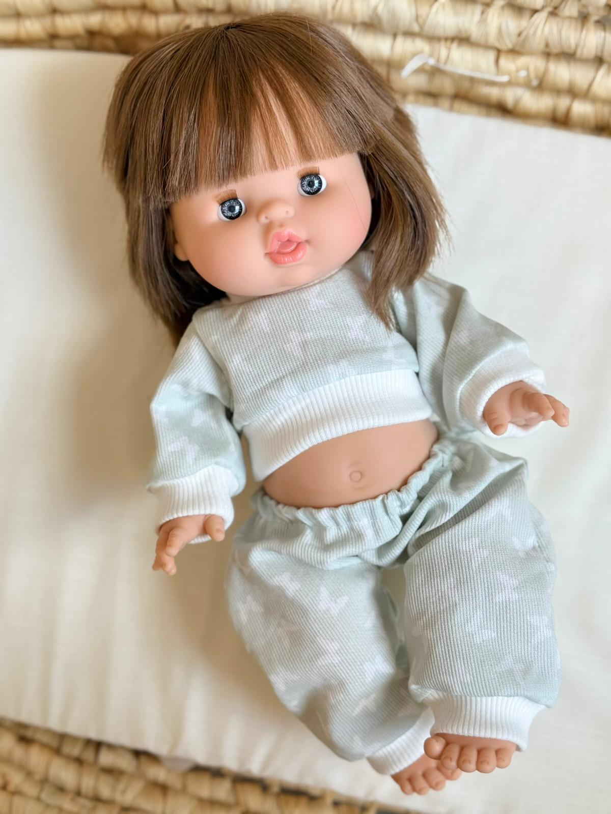 Uroczy komplet dresowy w pastelowej, miętowej tonacji z subtelnym wzorem. Składa się z bluzy zapinanej na wygodny rzep – łatwej do założenia nawet dla małych rączek – oraz spodni na gumce. Całość wykonana z miękkiego, prążkowanego materiału, który zapewnia komfort i styl. Komplet pasuje na lalki Minikane i Paola Reina (34 cm) oraz Miniland (38 cm).