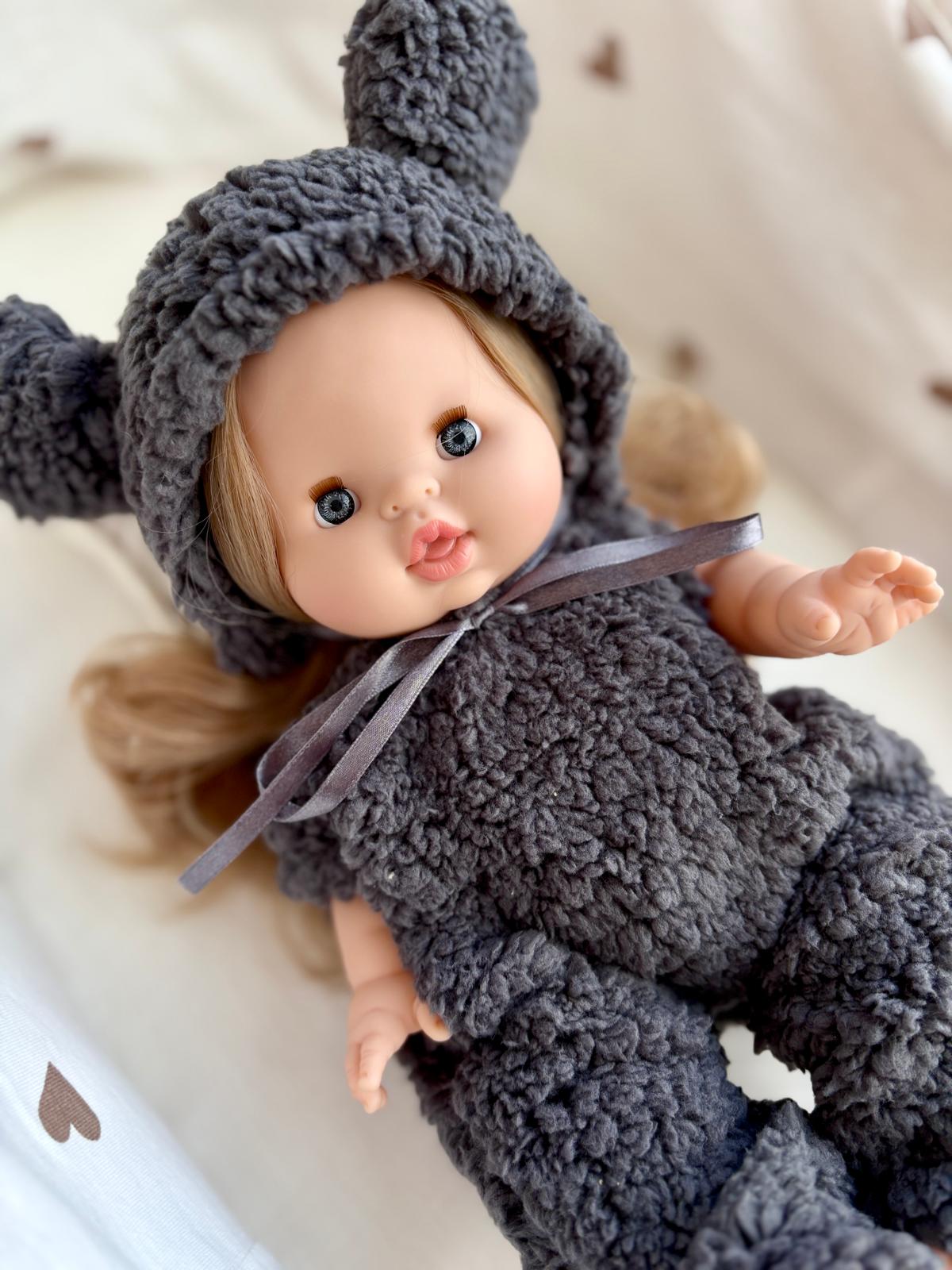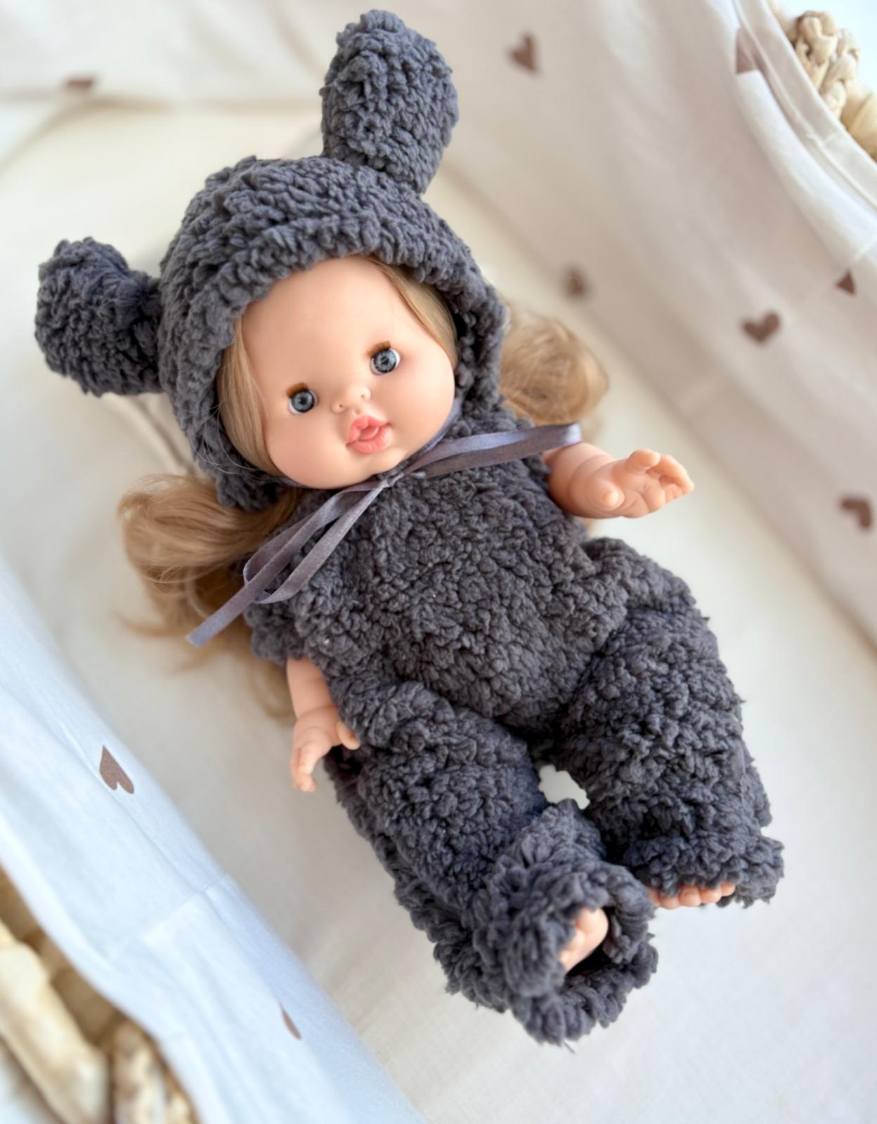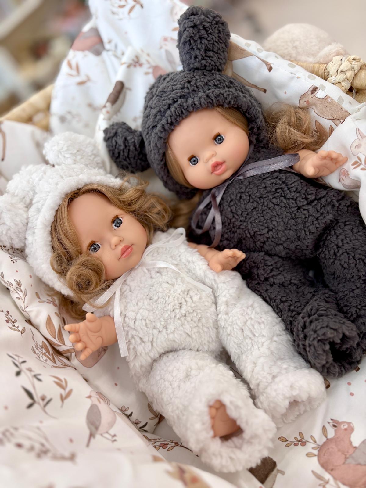 Uroczy, wykonany z wyjątkowo miękkiego materiału komplet z czapeczką z uszkami to idealny dodatek do garderoby lalki. Dzięki puszystemu materiałowi oraz delikatnym wykończeniom, ubranko prezentuje się niezwykle stylowo i przytulnie. W komplecie znajduje się:
