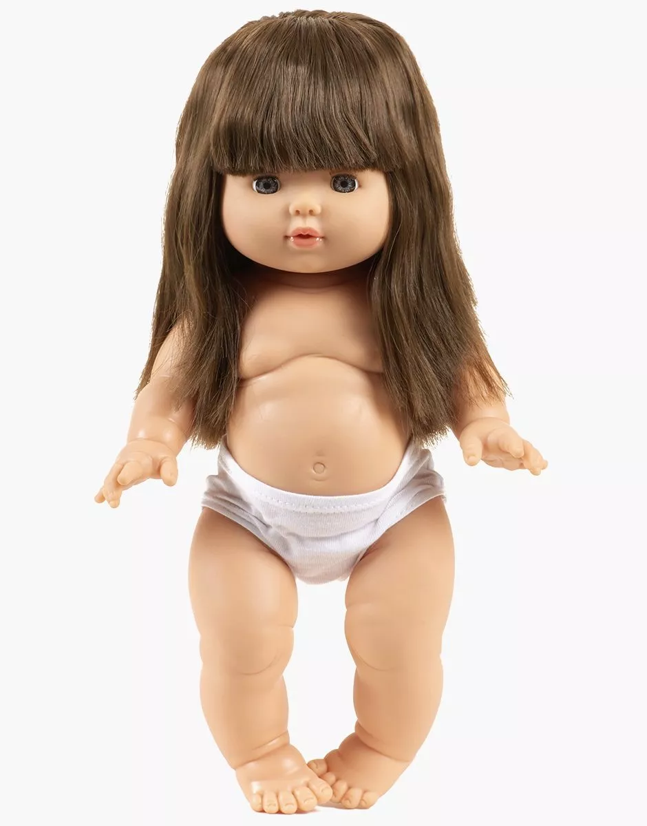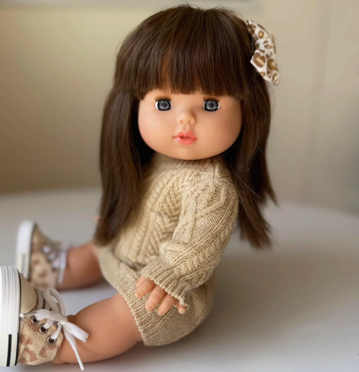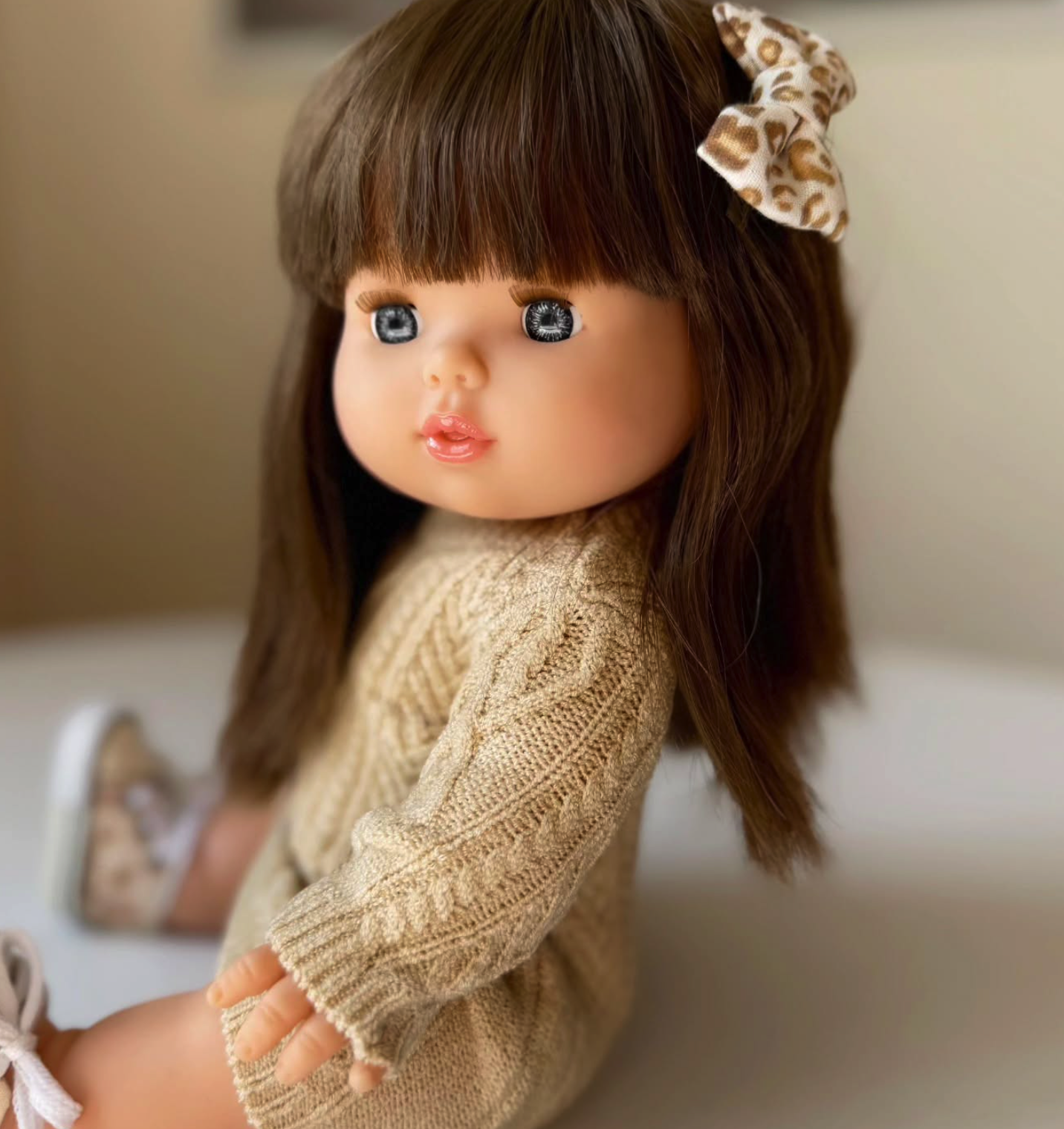 Laleczka posiada miękkie, brązowe/kasztanowe włosy z grzywką i niebiesko- szare oczy.