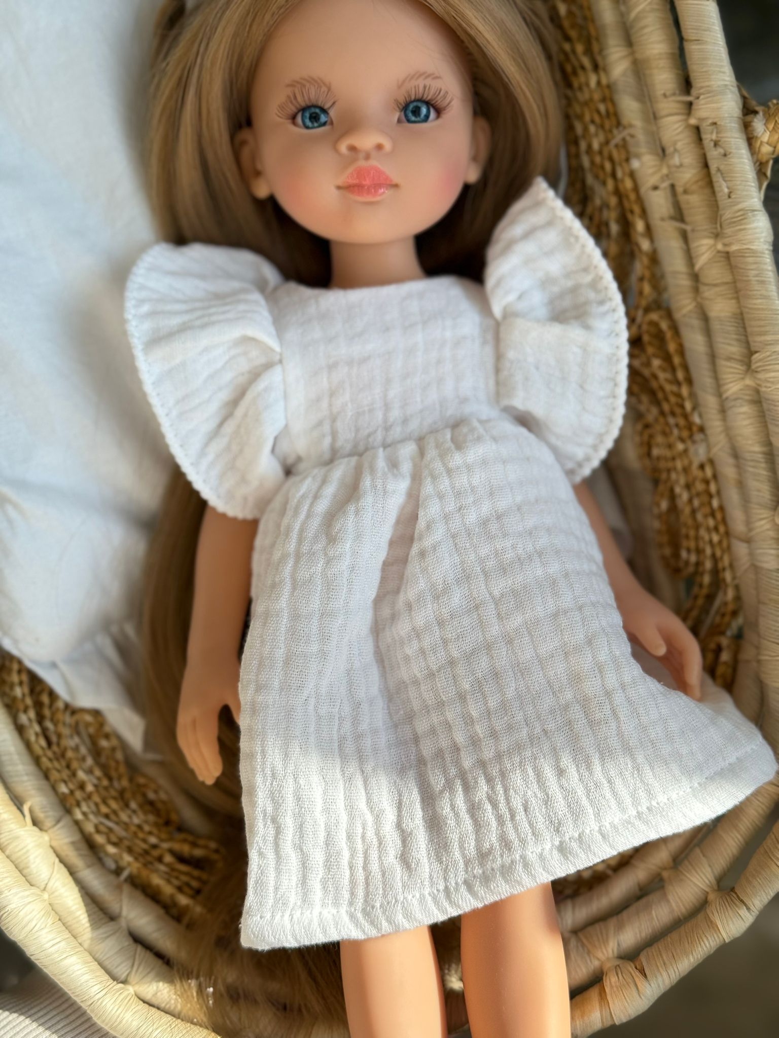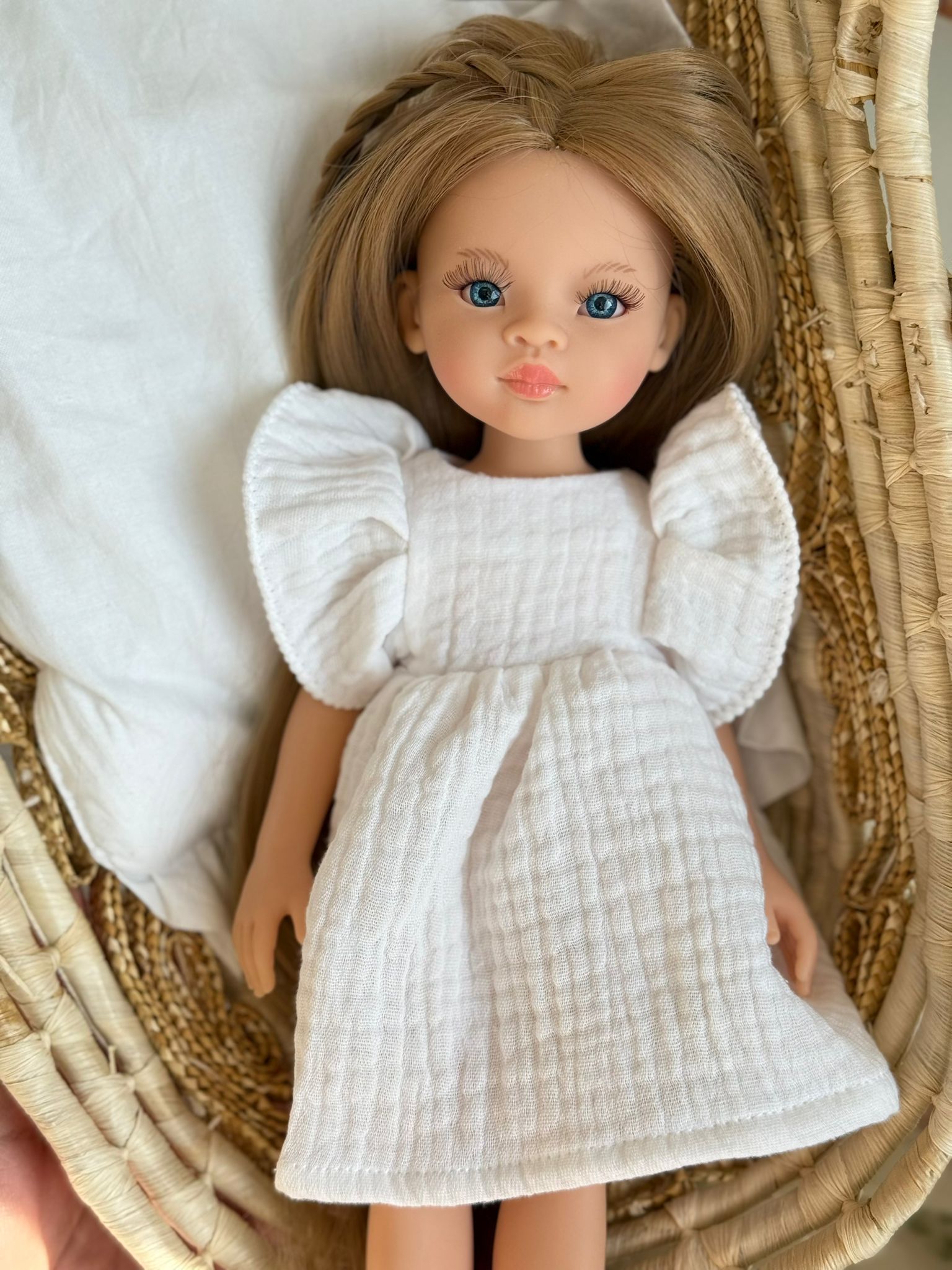 Piękna, romantyczna sukienka uszyta specjalnie dla lalki Paola Reina o wysokości 32 cm. Model wykonany z delikatnej, muślinowej tkaniny w pięknym, białym kolorze.