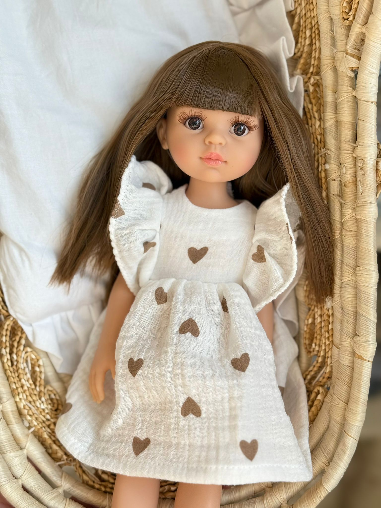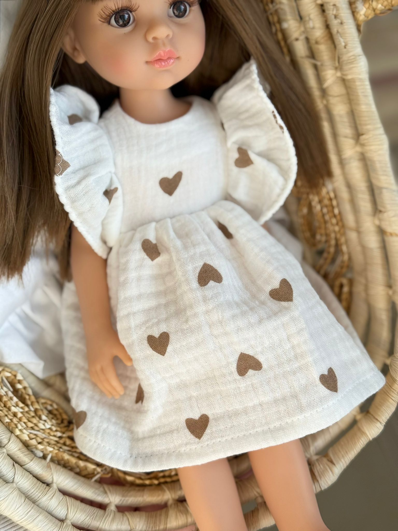 Piękna, romantyczna sukienka uszyta specjalnie dla lalki Paola Reina o wysokości 32 cm. Model wykonany z delikatnej, muślinowej tkaniny w subtelnym, białym kolorze w brązowe serduszka.