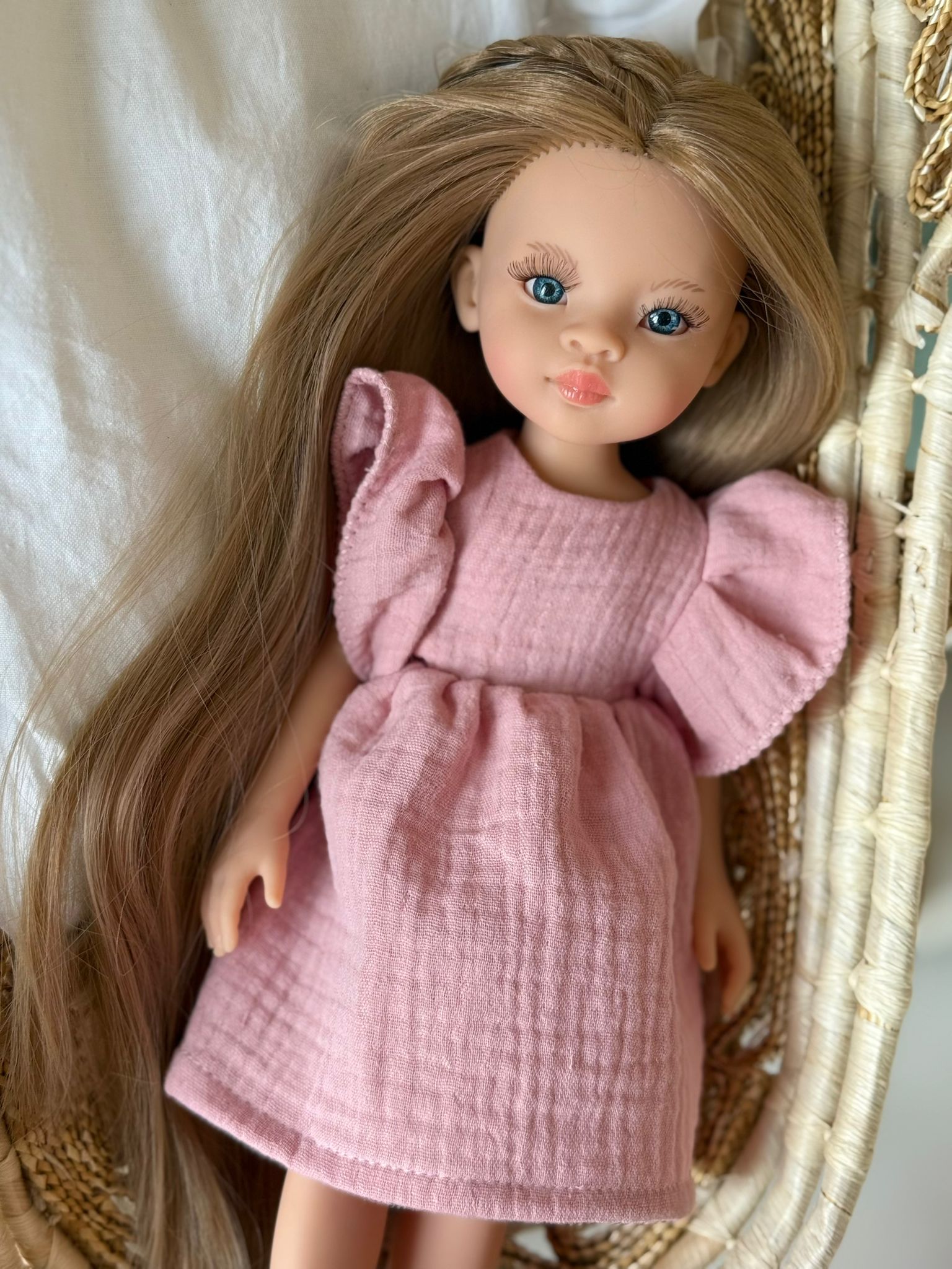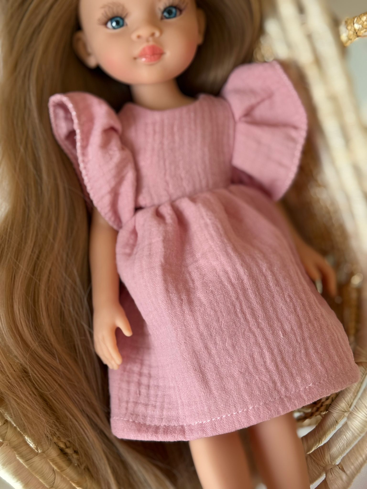 Piękna, romantyczna sukienka uszyta specjalnie dla lalki Paola Reina o wysokości 32 cm. Model wykonany z delikatnej, muślinowej tkaniny w cukierkowym, różowym kolorze.