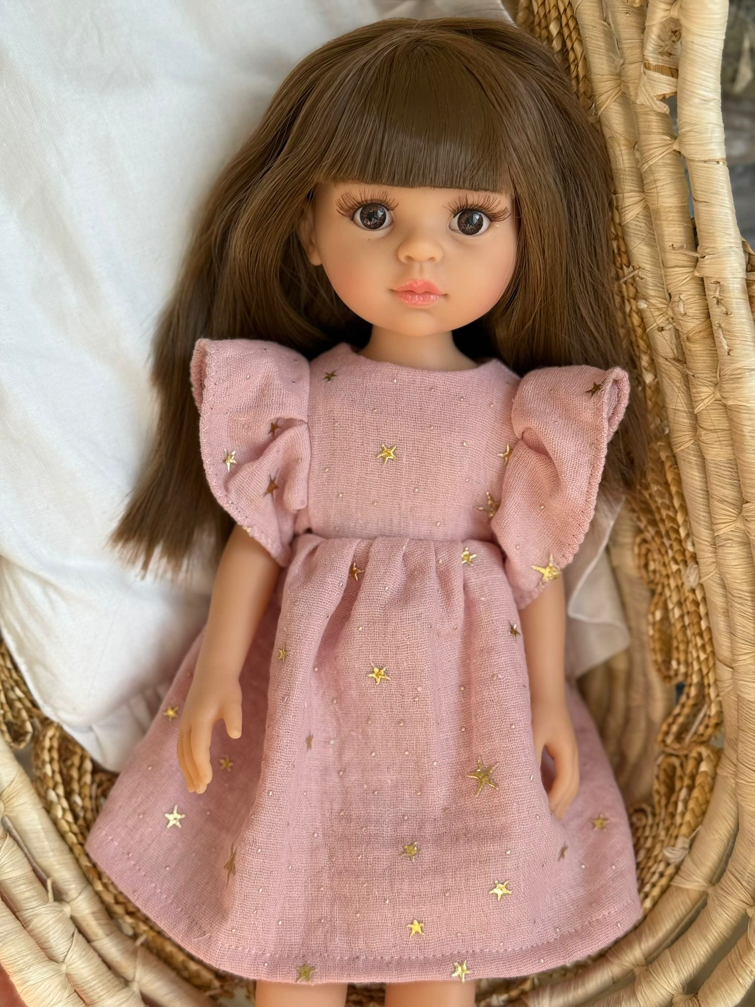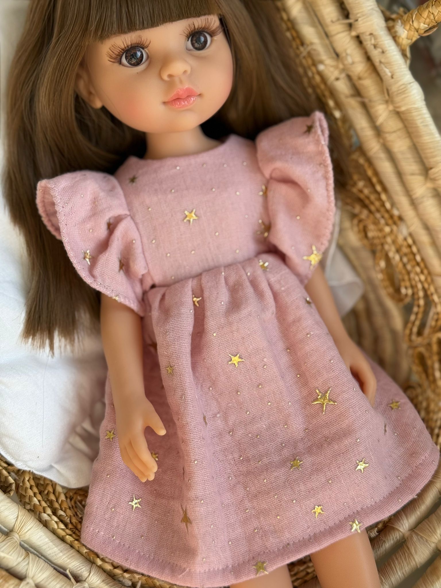 Piękna, romantyczna sukienka uszyta specjalnie dla lalki Paola Reina o wysokości 32 cm. Model wykonany z delikatnej, muślinowej tkaniny w subtelnym, różowym kolorze w złote gwiazdki.