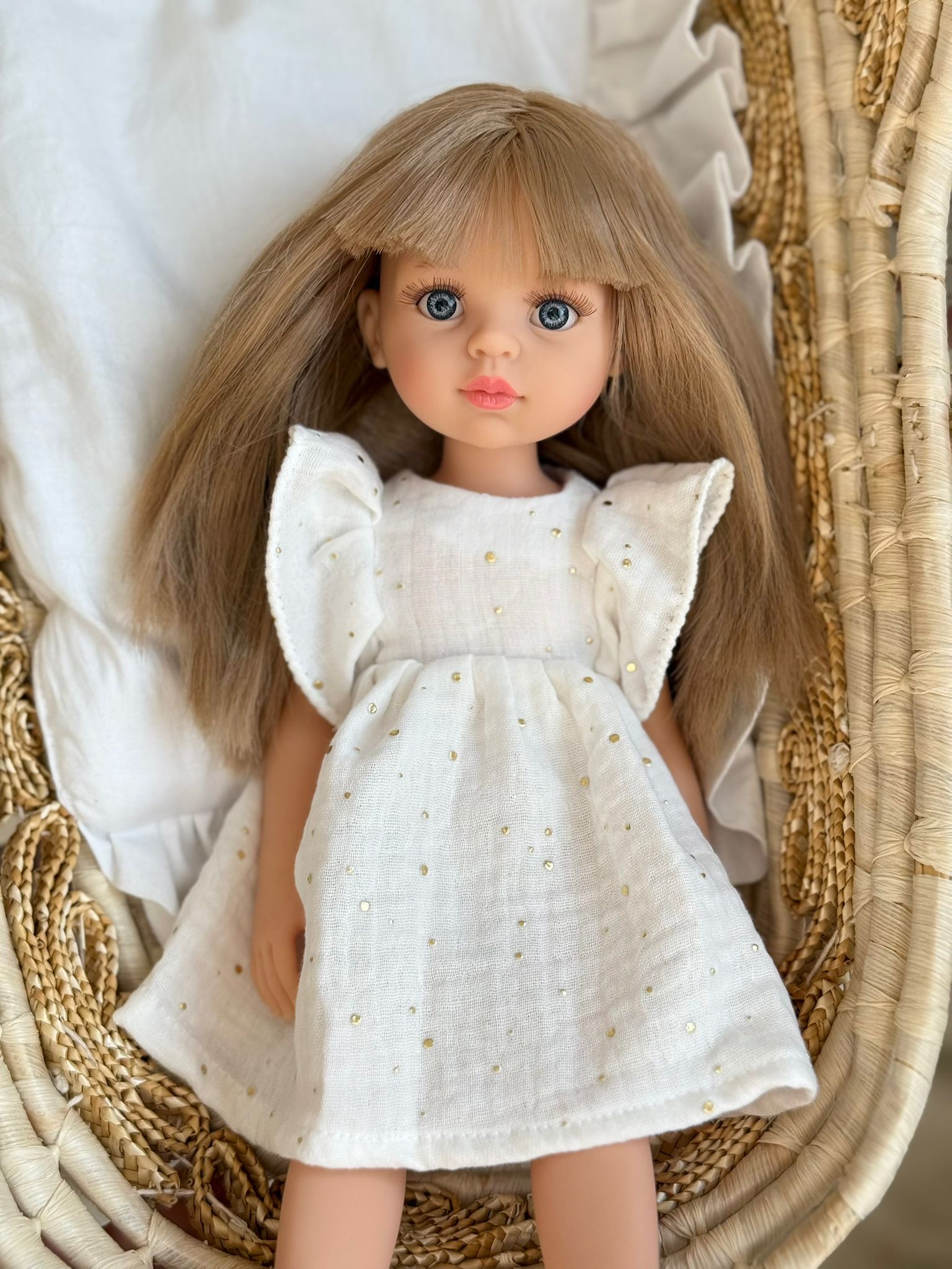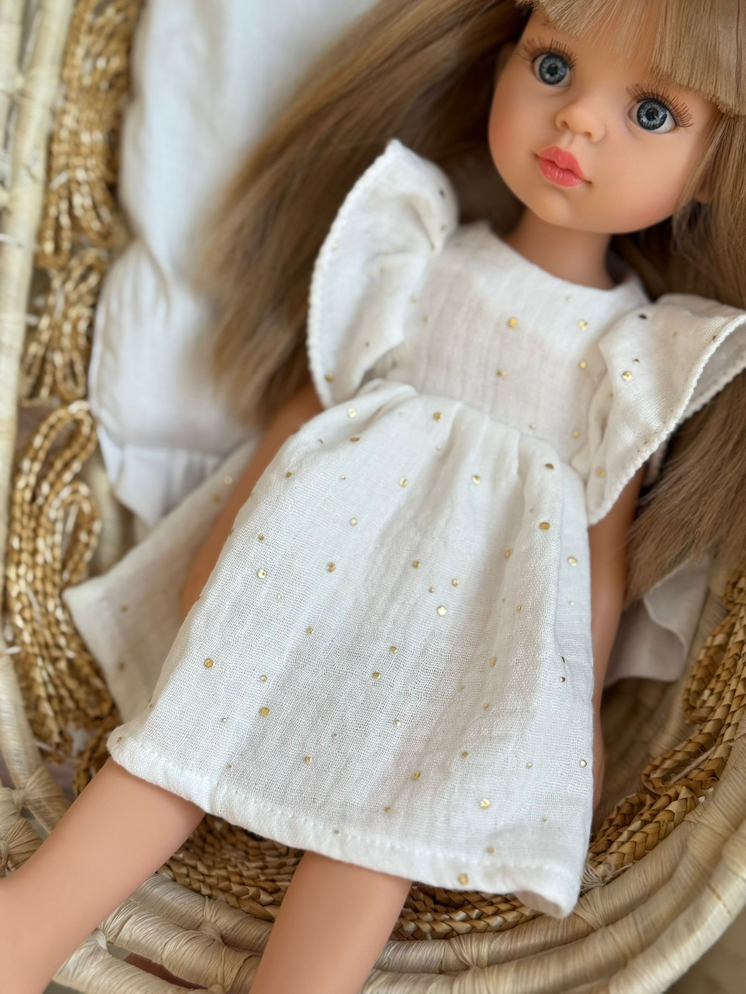 Stylowa sukienka uszyta specjalnie dla lalki Paola Reina o wysokości 32 cm. Model wykonany z delikatnej, wysokiej jakości tkaniny w białym kolorze, ozdobionej subtelnymi złotymi kropeczkami, które nadają stylizacji eleganckiego i dziewczęcego charakteru.