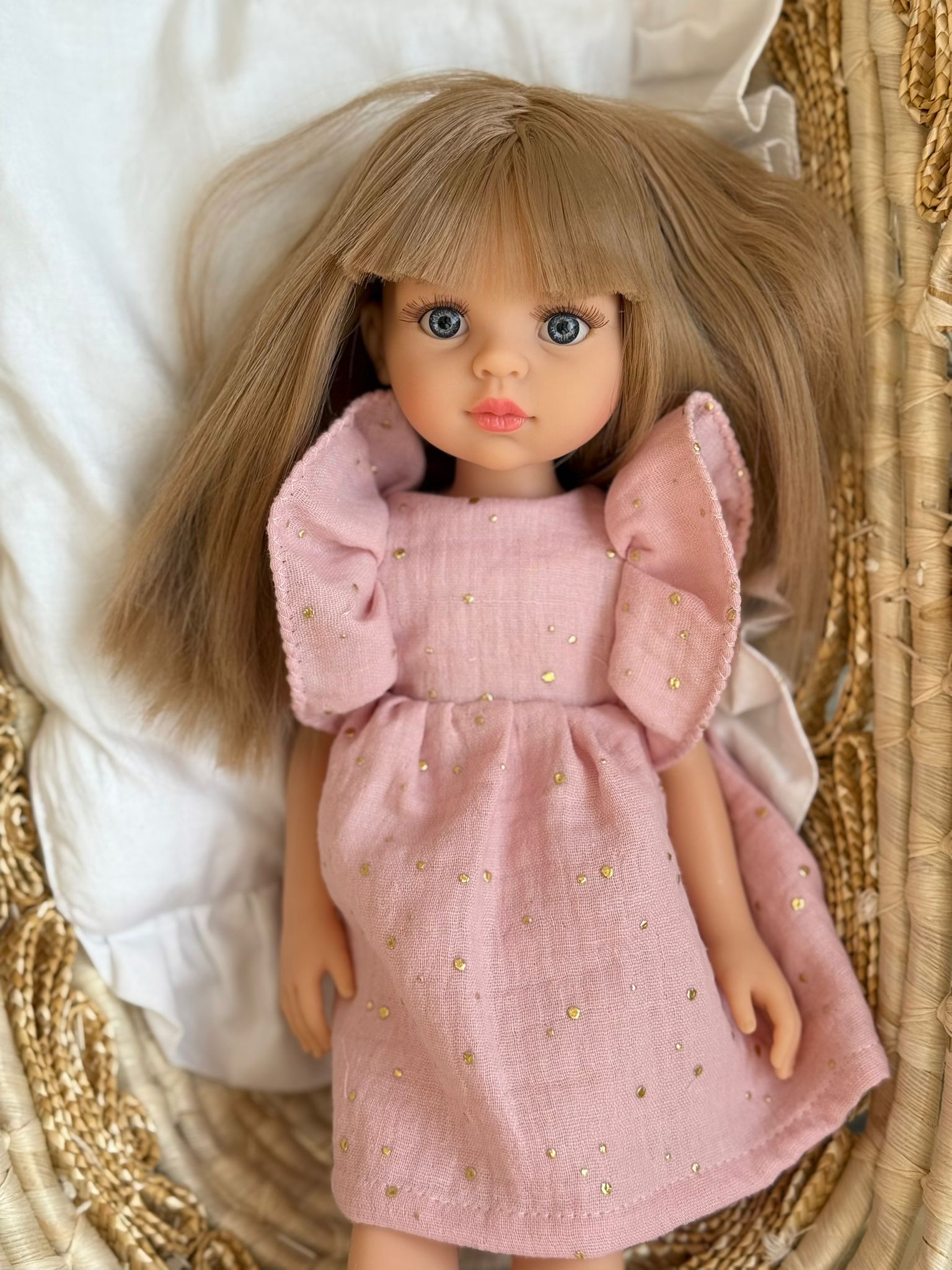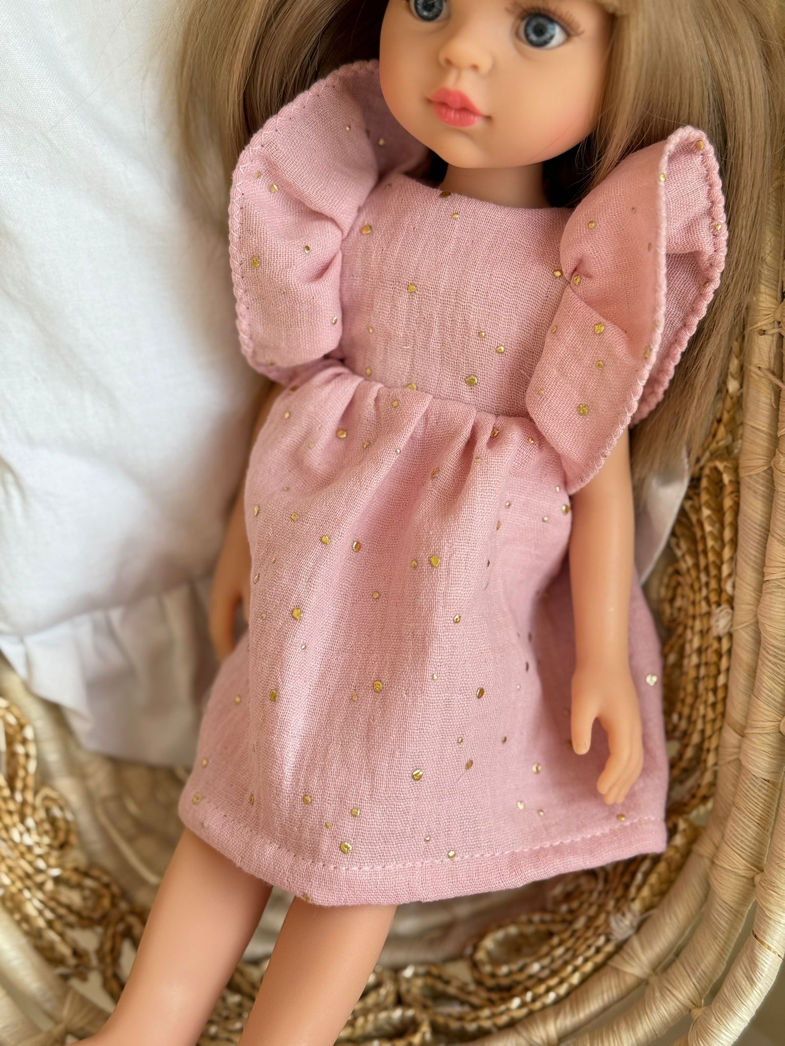 Stylowa sukienka uszyta specjalnie dla lalki Paola Reina o wysokości 32 cm. Model wykonany z delikatnej, wysokiej jakości tkaniny w pudrowo-różowym kolorze, ozdobionej subtelnymi złotymi kropeczkami, które nadają stylizacji eleganckiego i dziewczęcego charakteru.