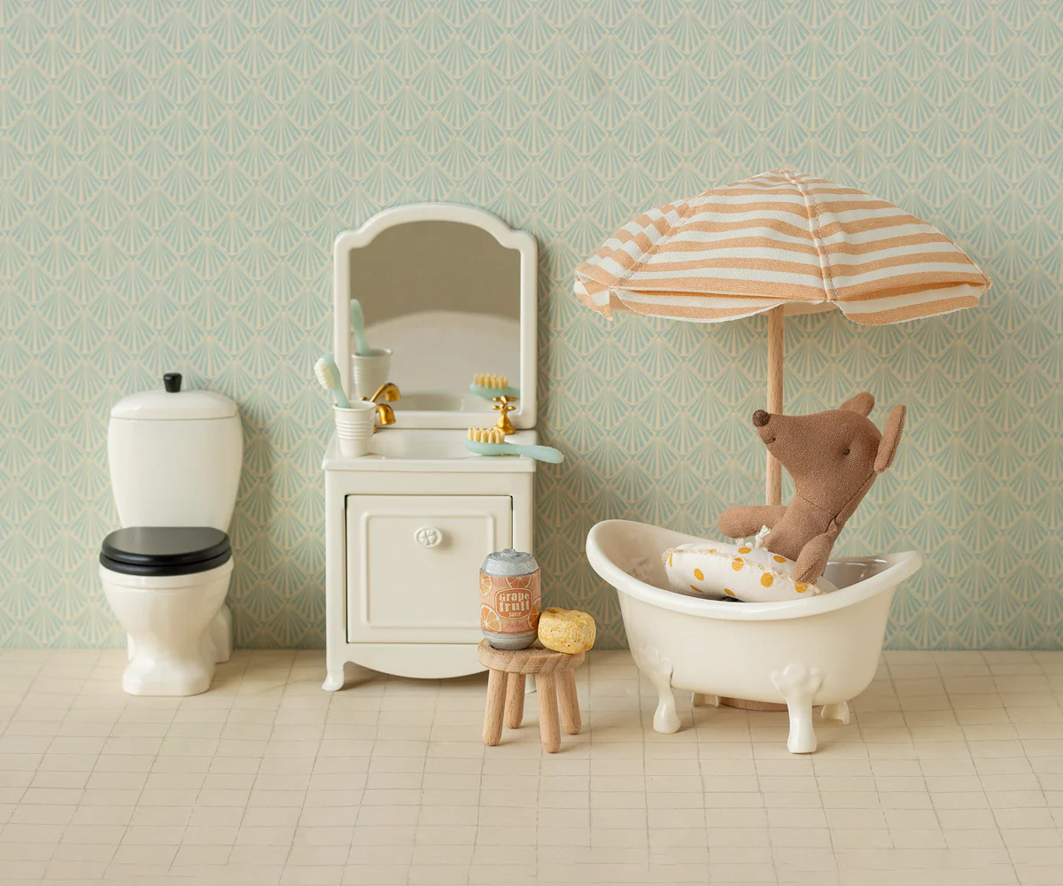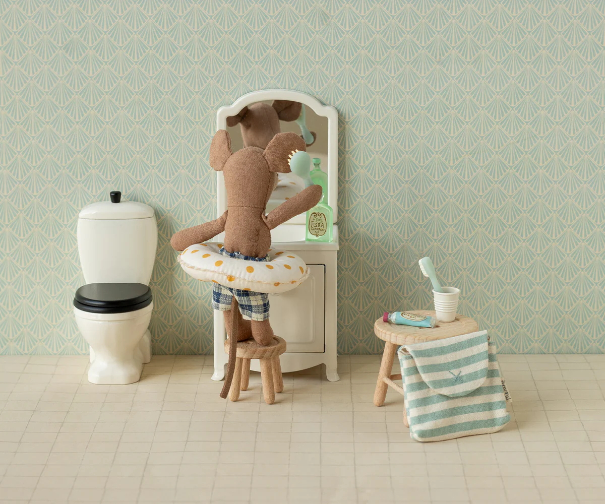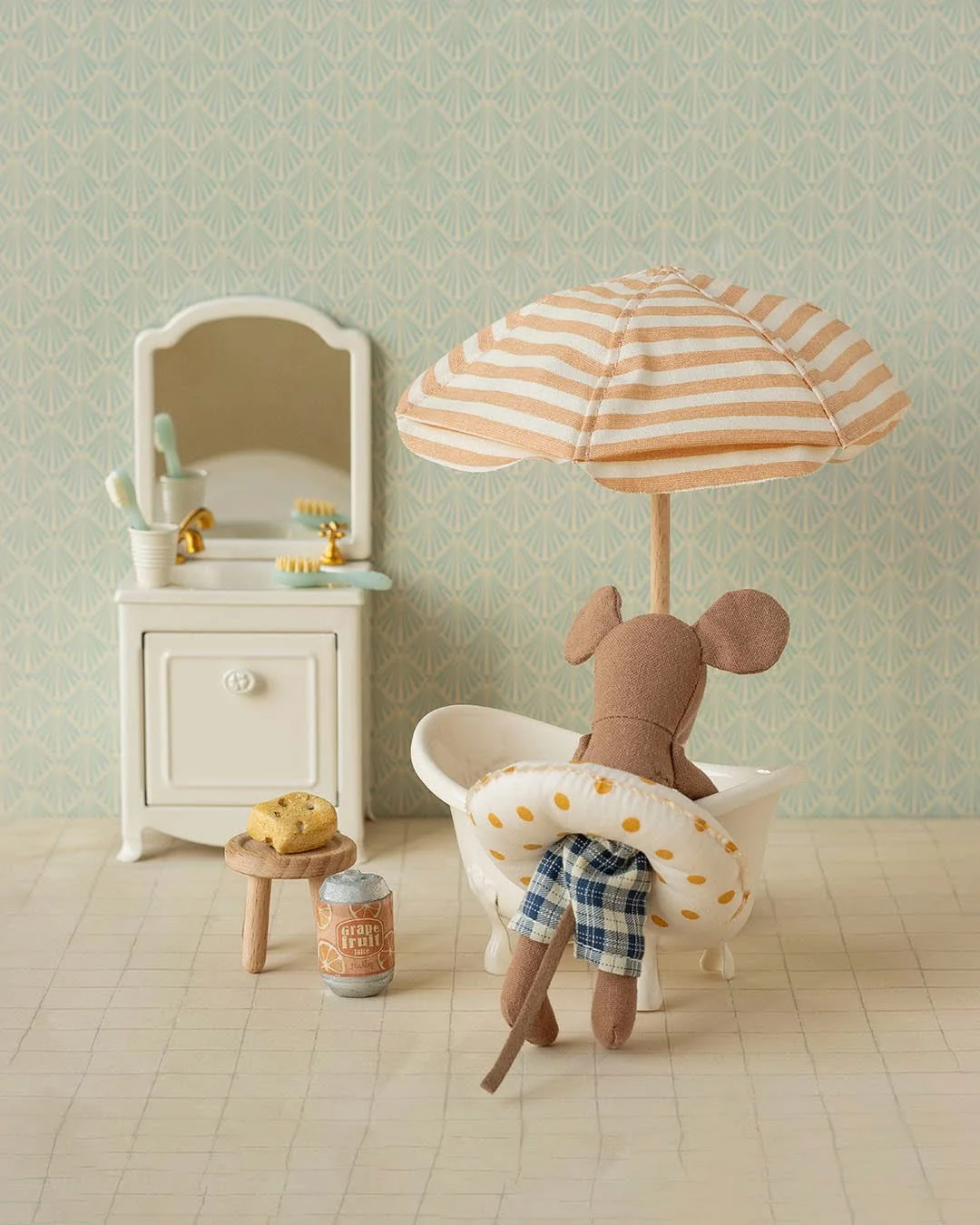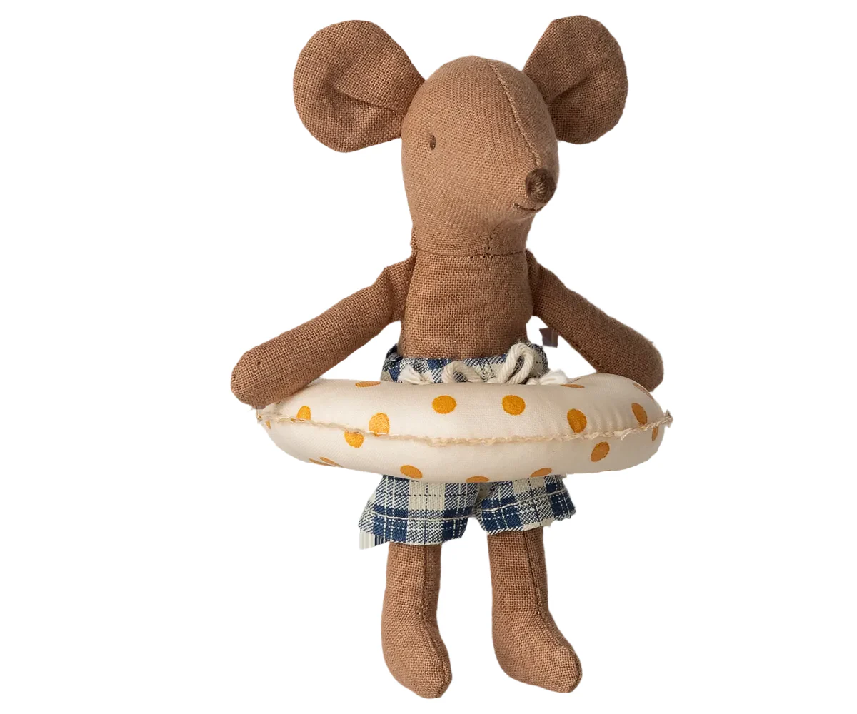 Myszka plażowa Maileg w wersji młodszego brata to gotowy towarzysz letnich przygód. Ubrana w stylowy strój kąpielowy i wyposażona w kolorowe koło do pływania, zachęca do odgrywania wakacyjnych scenek pełnych słońca, wody i beztroskiej zabawy.