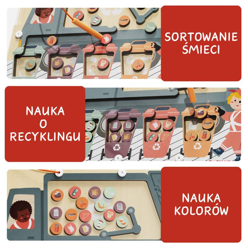 Zadaniem dziecka jest dopasowanie magnetycznych elementów przedstawiających różne rodzaje odpadów do odpowiednich pojemników. Taka forma zabawy wspiera rozumienie zasad segregacji, koncentrację oraz koordynację ręka–oko, a także zachęca do rozmów o ochronie środowiska i codziennych ekologicznych wyborach.