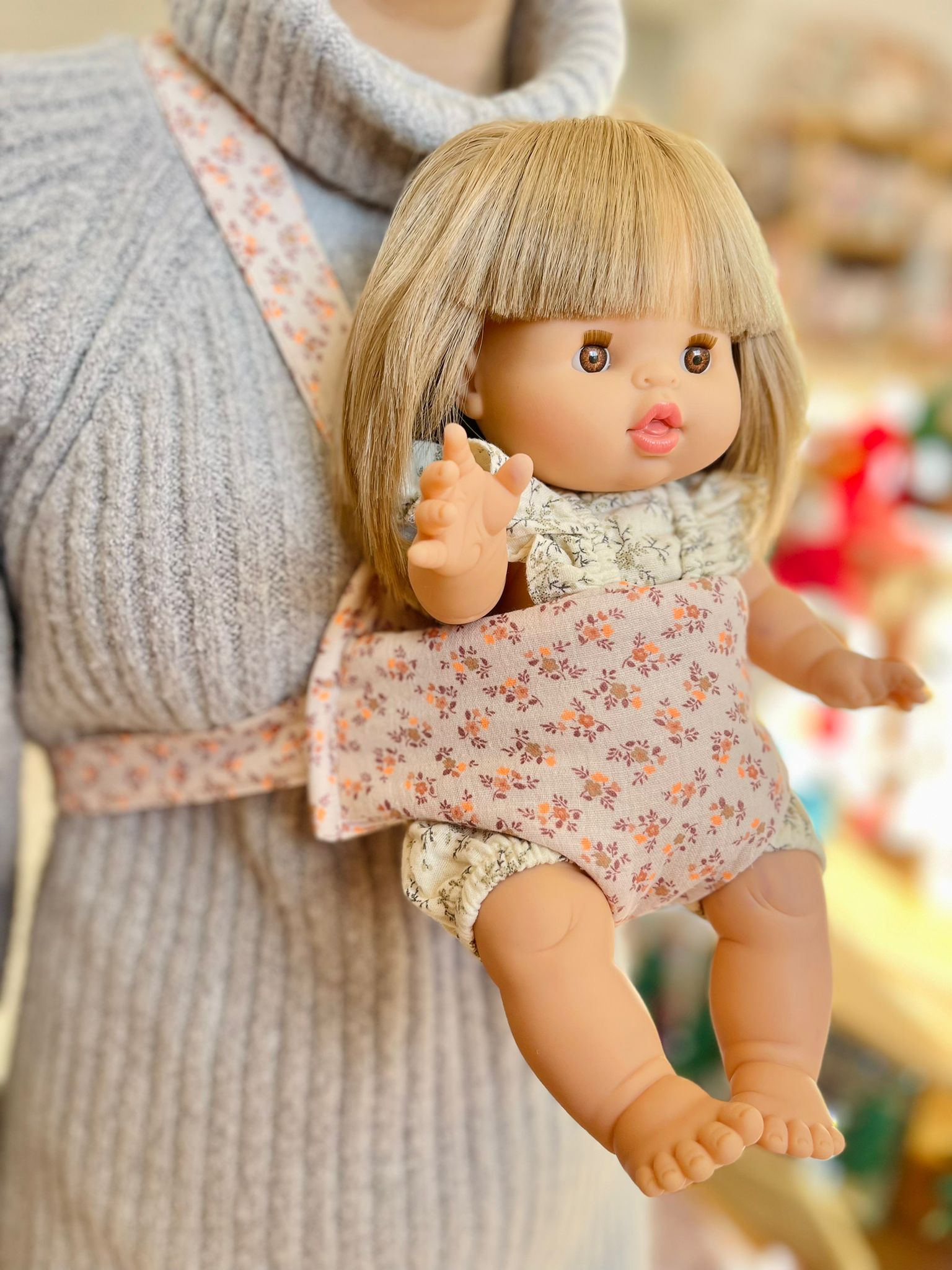 Lekkie nosidełko dla lalki z muślinowej tkaniny w kolorze beżowym z motywem jaskrawych kwiatków to świetny sposób, aby Twoje dziecko miało swoją ulubioną lalkę zawsze przy sobie. Jest to również cudowny sposób na zabawę w naśladowanie dorosłych, będzie mogło nosić lalkę, tak jak mama nosi dziecko.