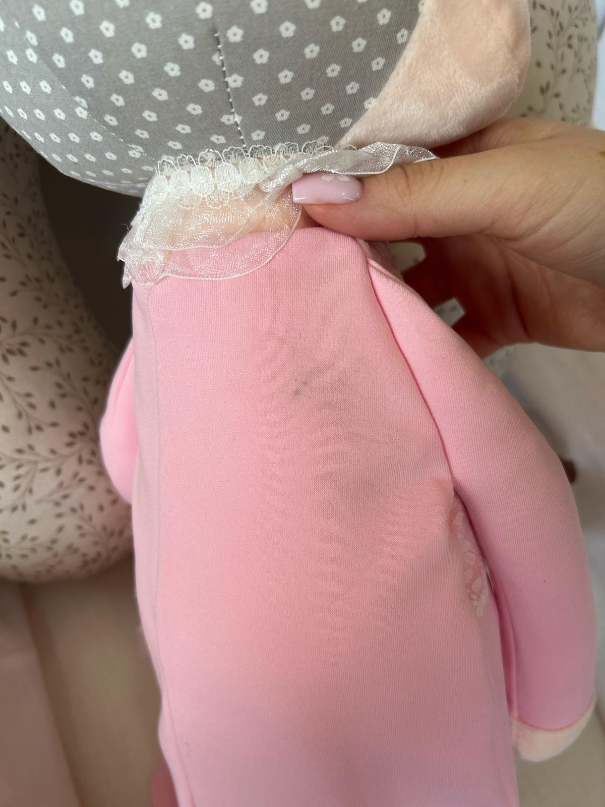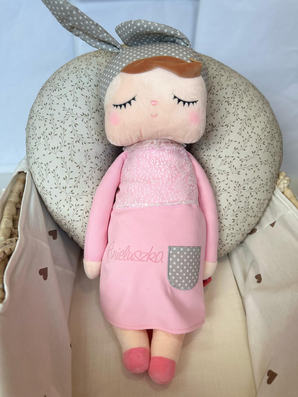Śpiąca lalka z uszkami w różowej sukience w rozmiarze XL to wersja jednej z najpopularniejszych lalek uszatek Metoo.