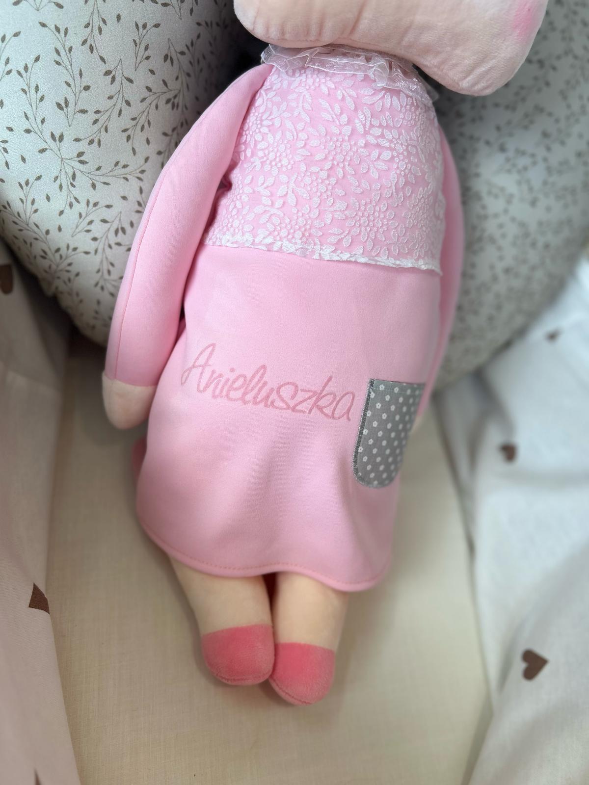 Lalka posiada gotowe już imię Anieluszka w kolorze różowym.