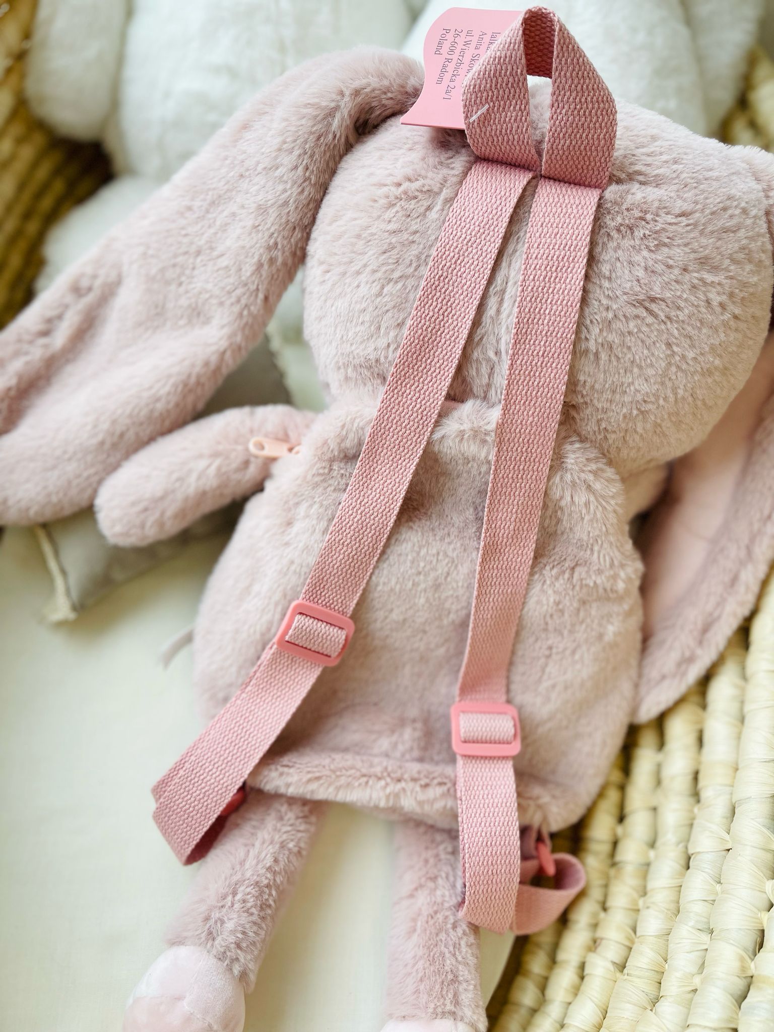 Pluszowy plecak Królik jest zapinany u góry na suwak.