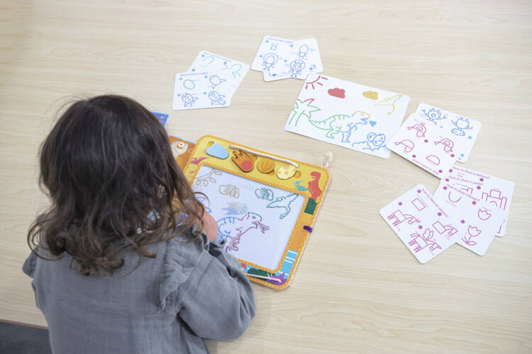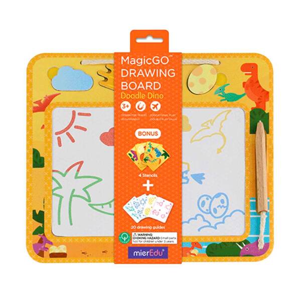 Zawartość: tablica do rysowania, 20 kart z instrukcjami, 4 szablony, 4 stemple magnetyczne, drewniany rysik