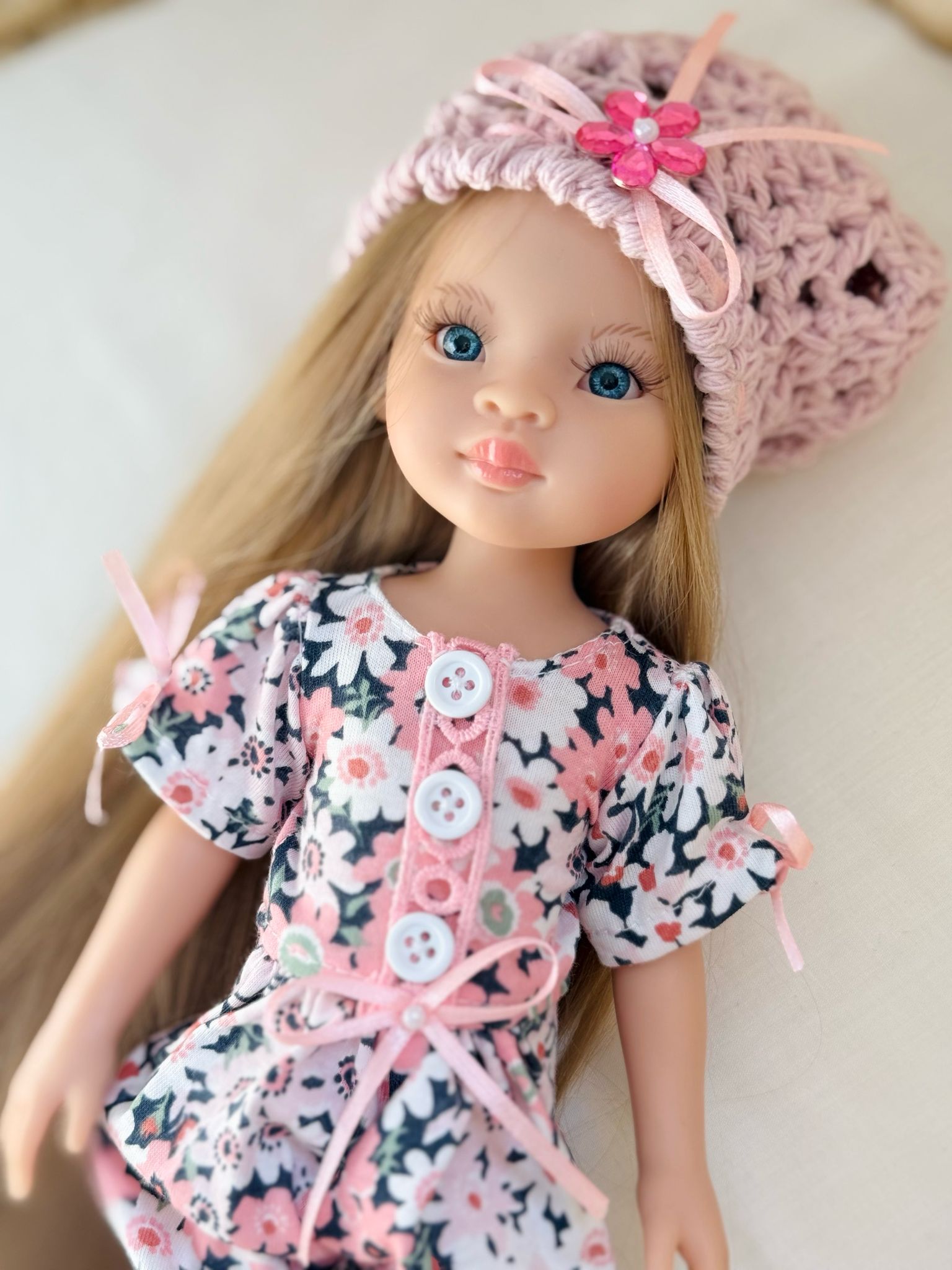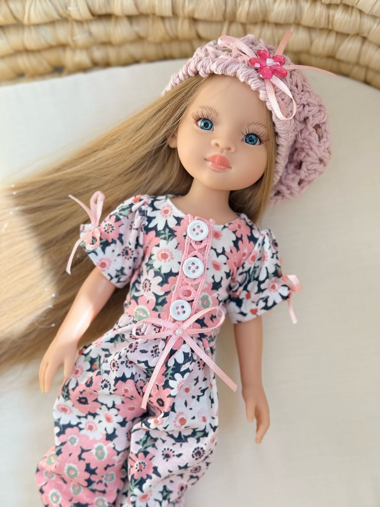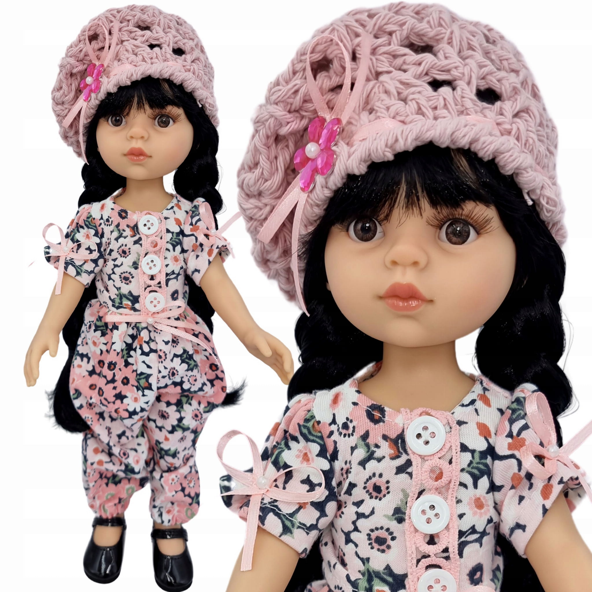 Ubranko dla lalki Paola Reina - Kombinezon w kwiatuszki i dziergany berecik