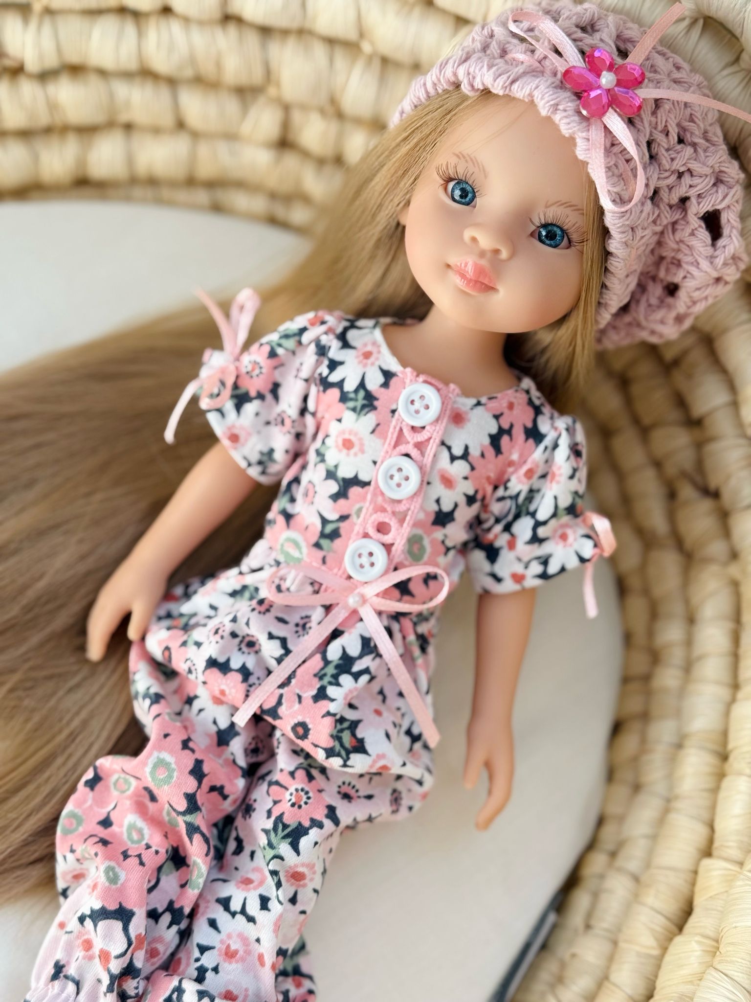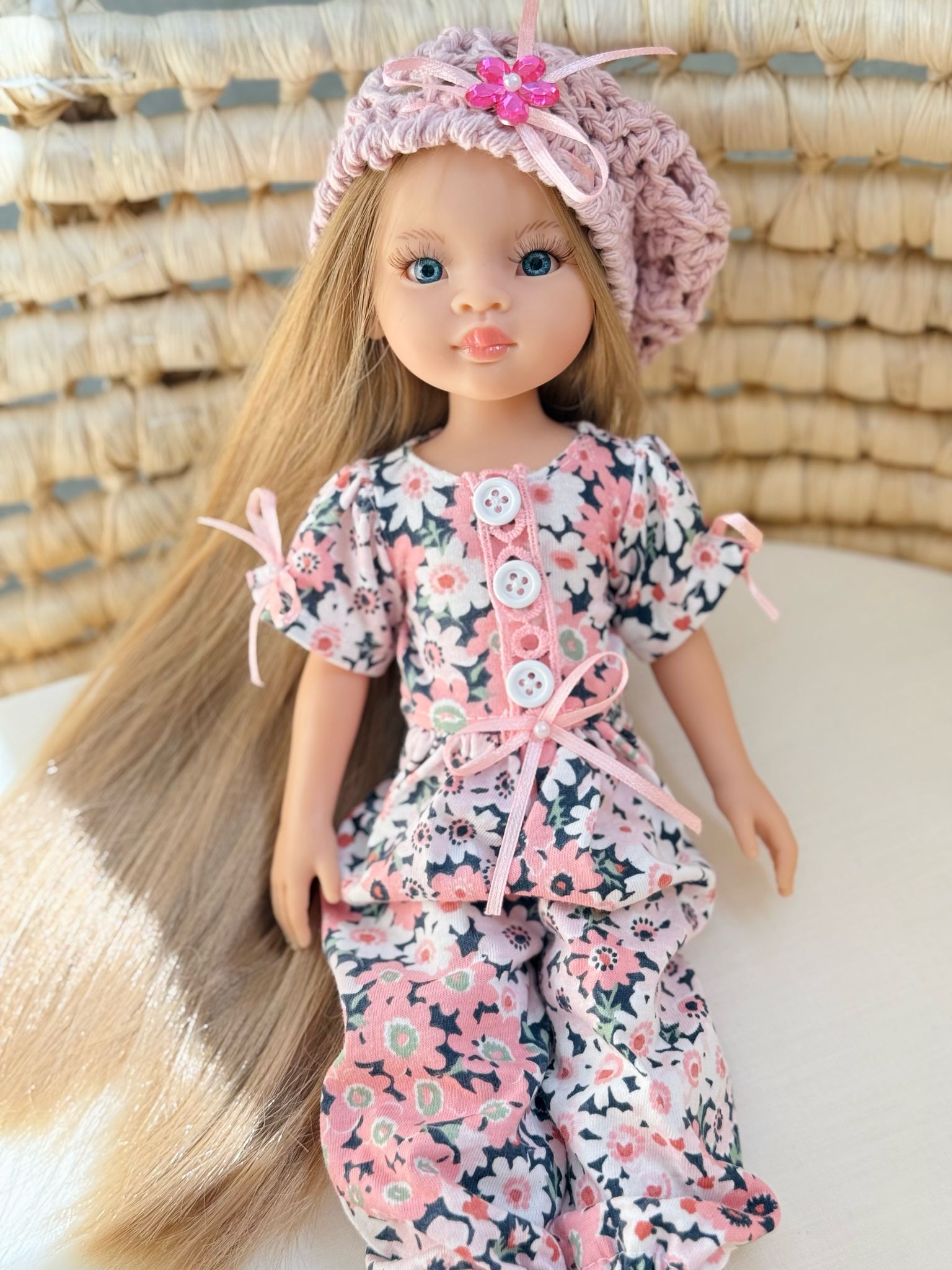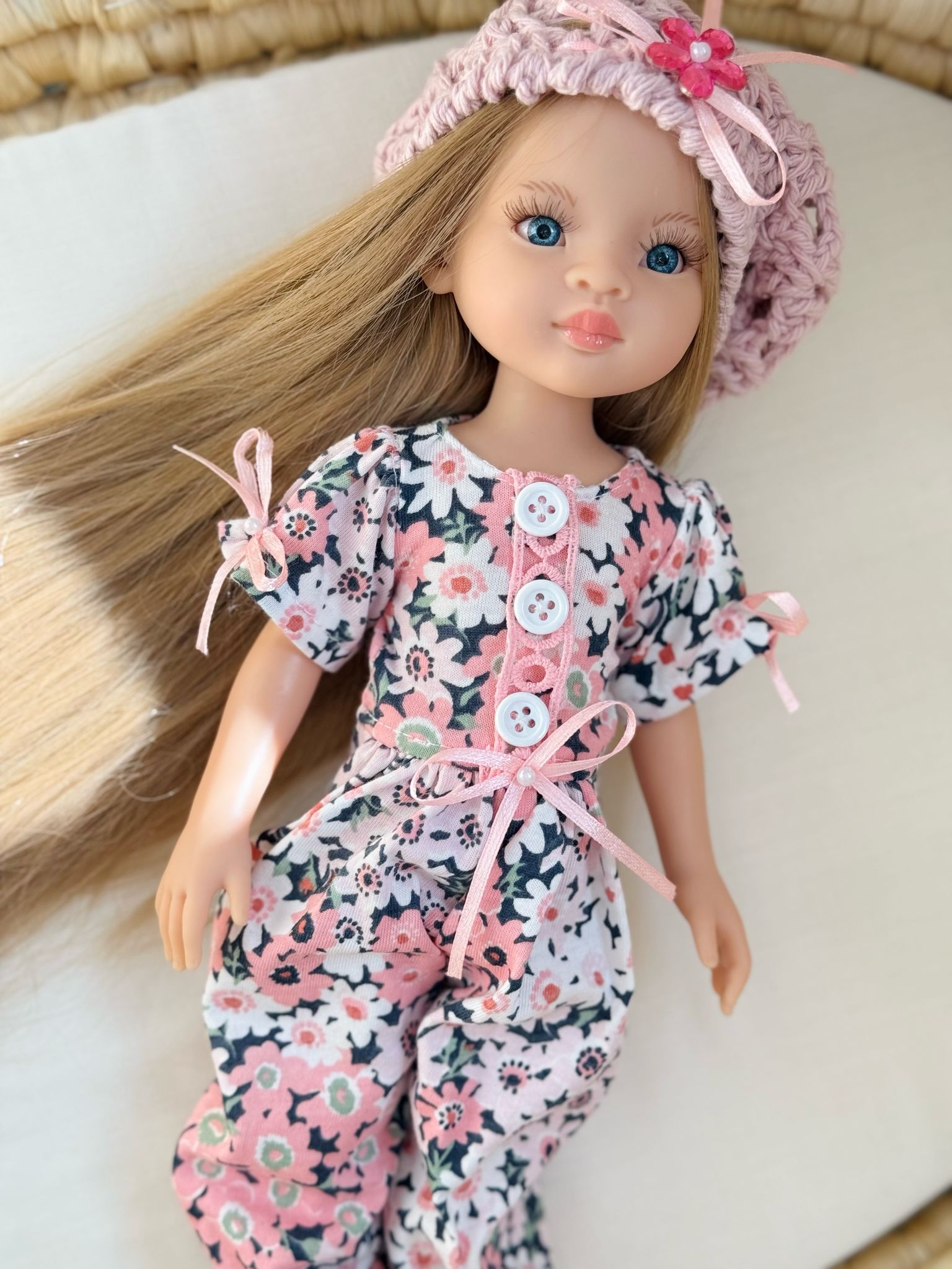 Ubranko dla lalki Paola Reina - Kombinezon w kwiatuszki i dziergany berecik