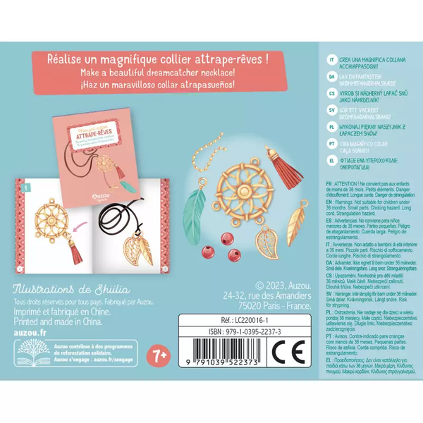 Zestaw DIY Boho naszyjnik z łapaczem snów od Auzou. Zestaw zawiera wszystkie niezbędne akcesoria do stworzenia niepowtarzalnego naszyjnika w stylu boho z łapaczem snów oraz instrukcję jego wykonania. Zawartość zestawu: metalowy łapacz snów, wspaniałe piórko, małe koraliki, łańcuszek, pompon i mniejsze zawieszki. Zapakowany w ładne, kartonowe pudełeczko z szybką. Będzie doskonałym prezentem dla każdej dziewczynki lub jej przyjaciółki. Zestawy biżuterii DIY to fantastyczna propozycja kreatywnej zabawy rozwijającej poczucie estetyki, zdolności manualnych oraz rewelacyjny trening skupienia. Będzie świetnym uzupełnieniem do pozostałych zestawów biżuterii od Auzou.