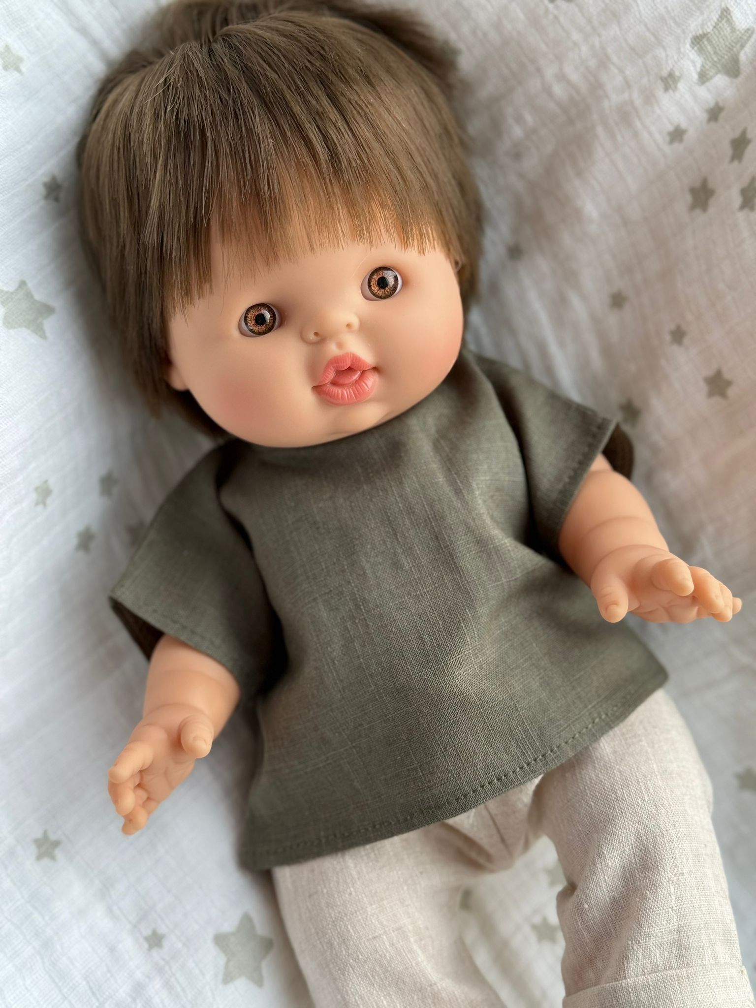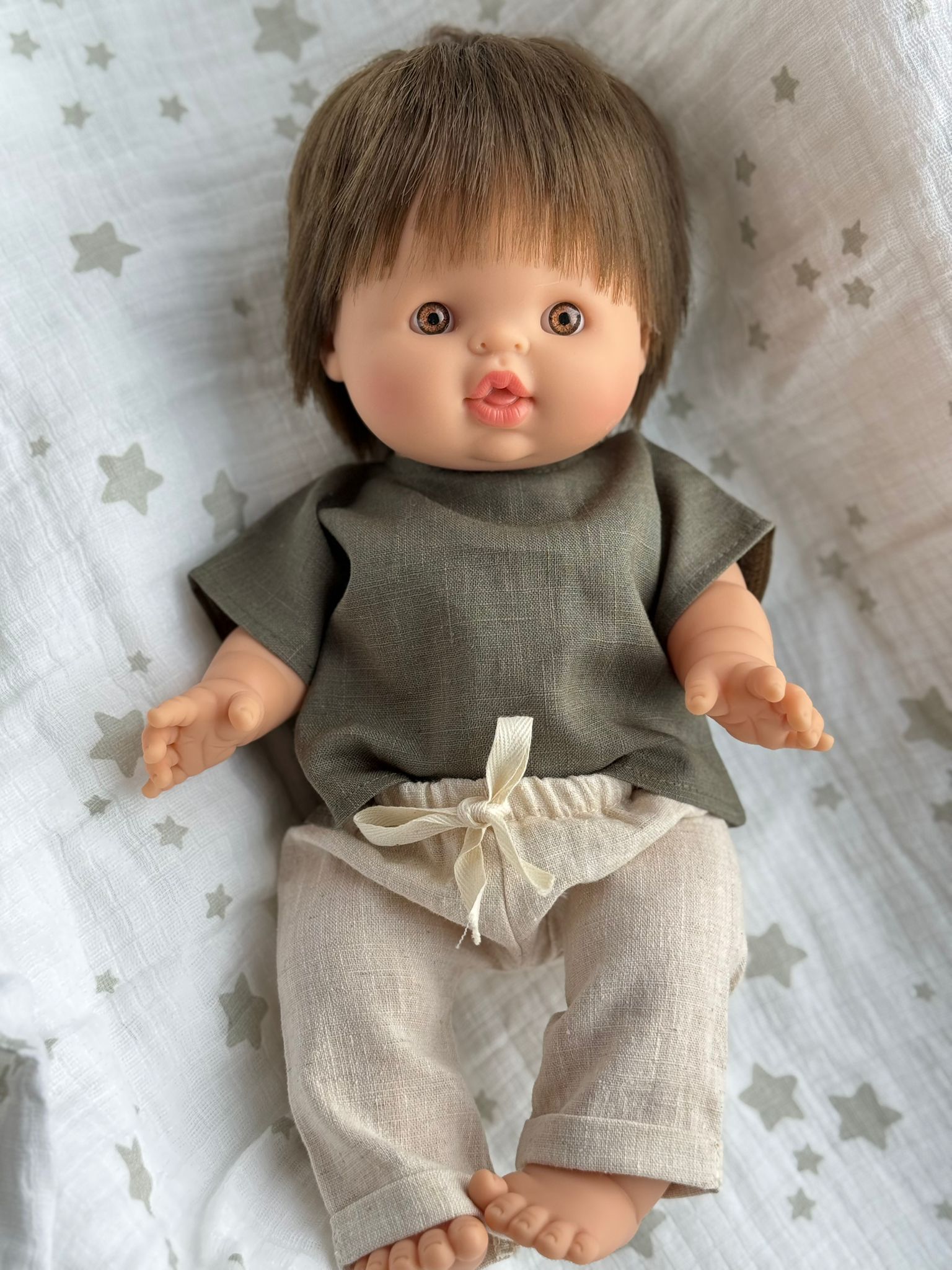 Zestaw lniany – zielona bluzka i spodnie w paski dla lalki Minikane i Paola Reina 34 cm i Miniland 38 cm