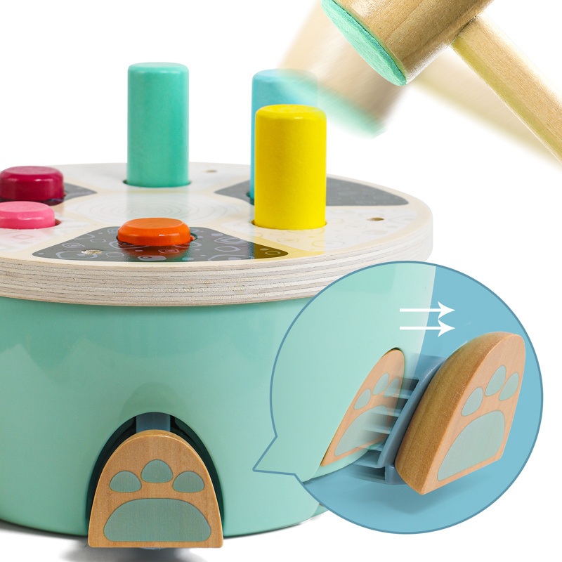 Zadaniem dziecka jest wbijanie kolorowych elementów za pomocą drewnianego młoteczka, co doskonale ćwiczy siłę dłoni i precyzję ruchów. Intensywne, ale przyjemne dla oka kolory pomagają w nauce rozpoznawania barw, a prosta forma zabawki sprawia, że jest ona intuicyjna i dostosowana do możliwości najmłodszych.