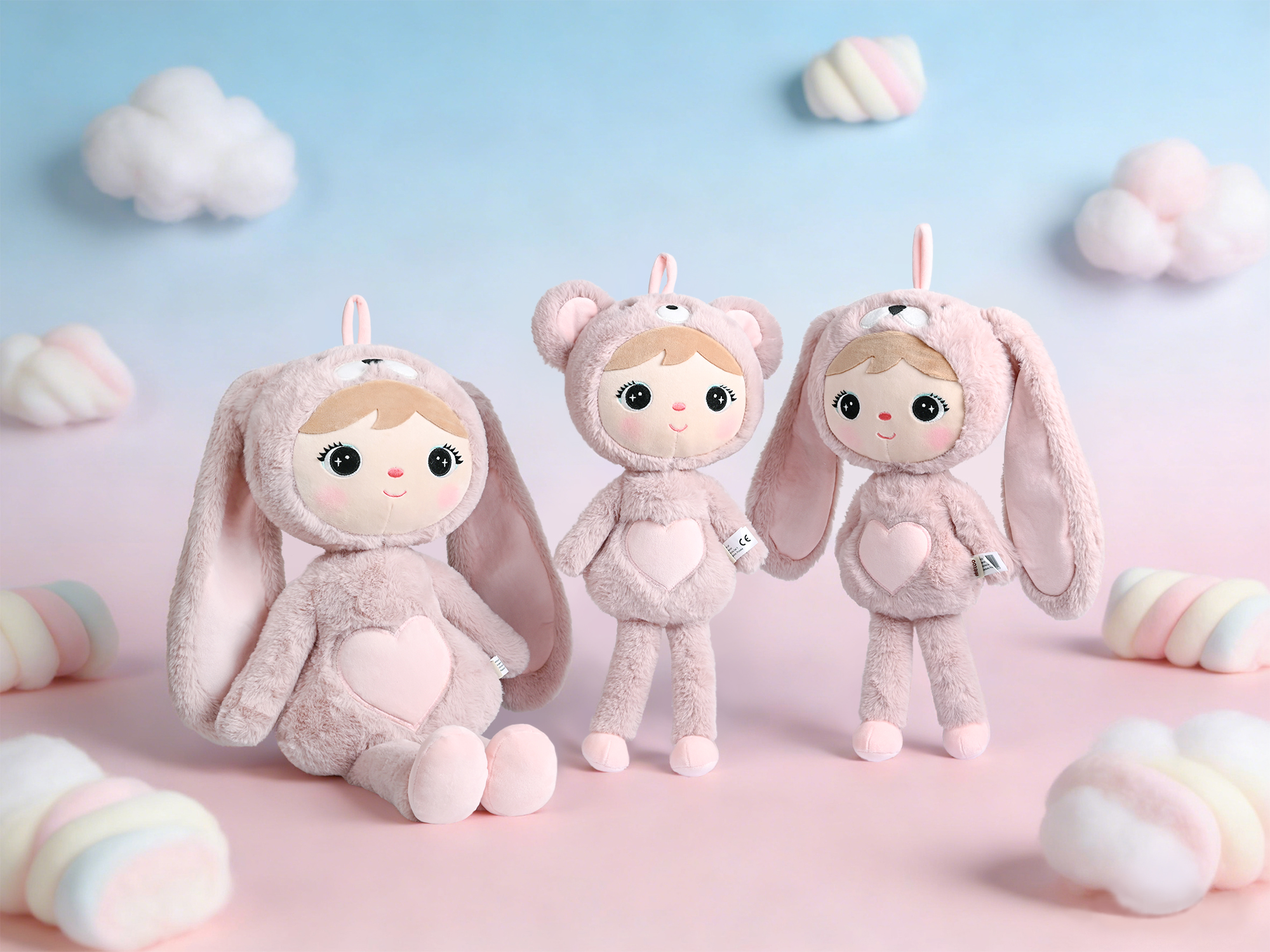 Króliczki mają ciekawe dla dzieci elementy takie jak duże oczy i rzęsy, długie uszka, piękne kolory i miękkie materiały. Są leciutkie i poręczne mimo swoich rozmiarów, u góry mają zawieszkę, więc łatwo je złapać w małe rączki lub powiesić na ścianie jako ozdoba pokoiku dziecięcego.